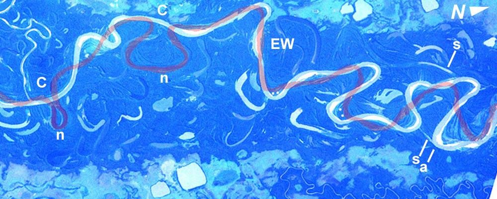 - An old course has controlled the position of a sector of the new course: the radius of curvature of the northernmost meander is sharper than most bends because the new course has occupied a prior course (a-far right, upper image).