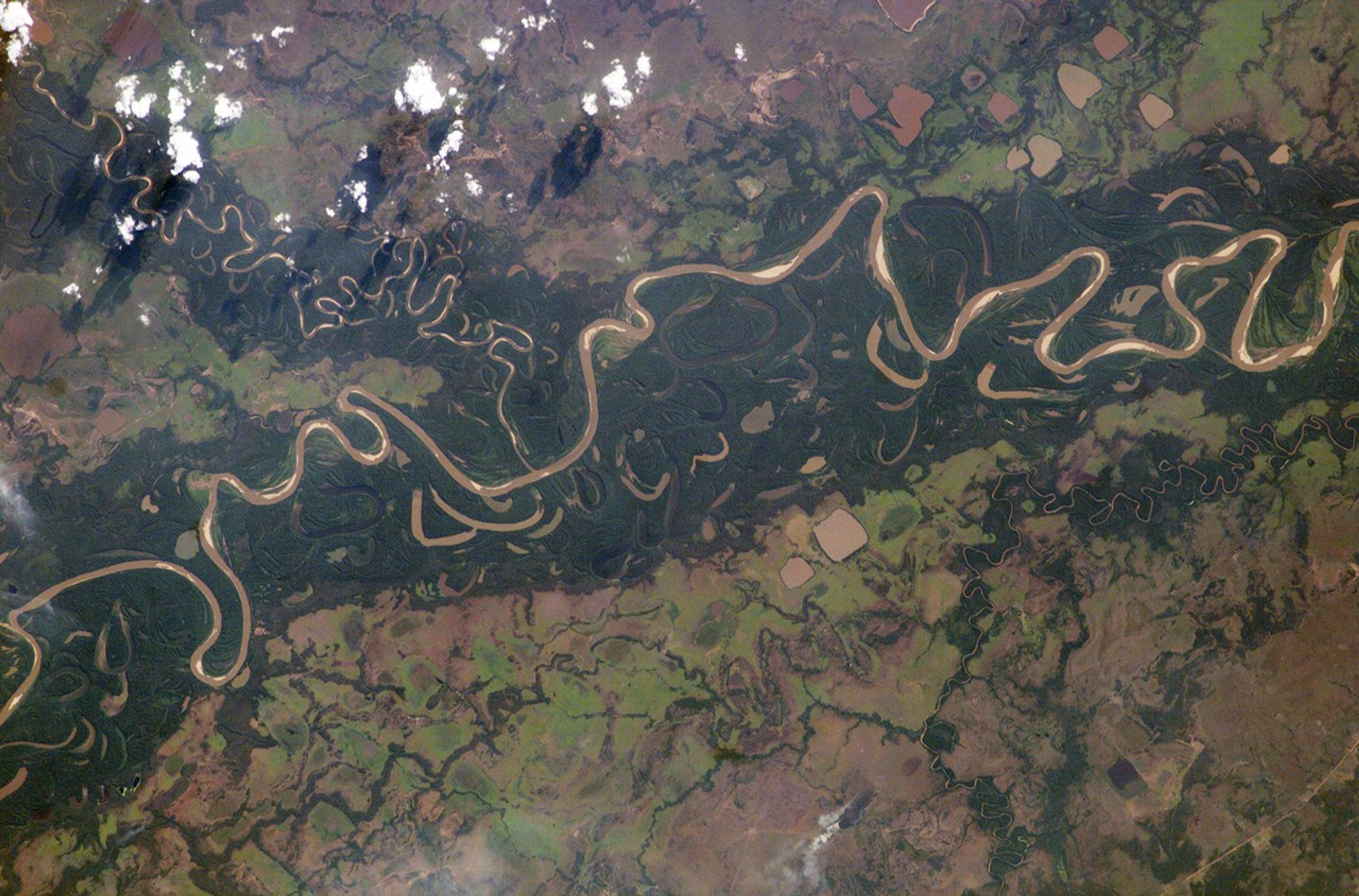 The ISS image (top) shows Mamore River meandering in a floodplain with numerous contorted channel traces indicating former positions of the river. The darker areas are riverine forest, the lighter areas tropical savanna. The river trace as it was in 1990 (bottom) is superimposed on the 2003 handheld image.