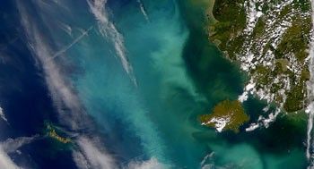 The coccolithophores are the exception. "They favor temperate conditions where the nutrients have been stripped away," said Balch. Under normal conditions, the coccolithophores do not compete well with other microscopic plants in nutrient-rich seas. When the competition is diminished by a low food source, the scaly plants have a chance. They usually end up proliferating in areas where the temperature is moderate, the sun is usually out, the water is calm, and the nutrient levels are low.