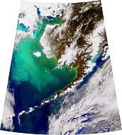 The coccolithophore blooms formed primarily above the continental shelf to the west of Alaska. This underwater shelf is roughly the size of California and extends several hundred miles off the Alaskan coast, where it drops off to the floor of the Pacific. At their peak, the scaly plants covered practically the entire area. The only place where coccolithophores didn’t appear was in a 50-mile-wide band off the coast of Alaska.