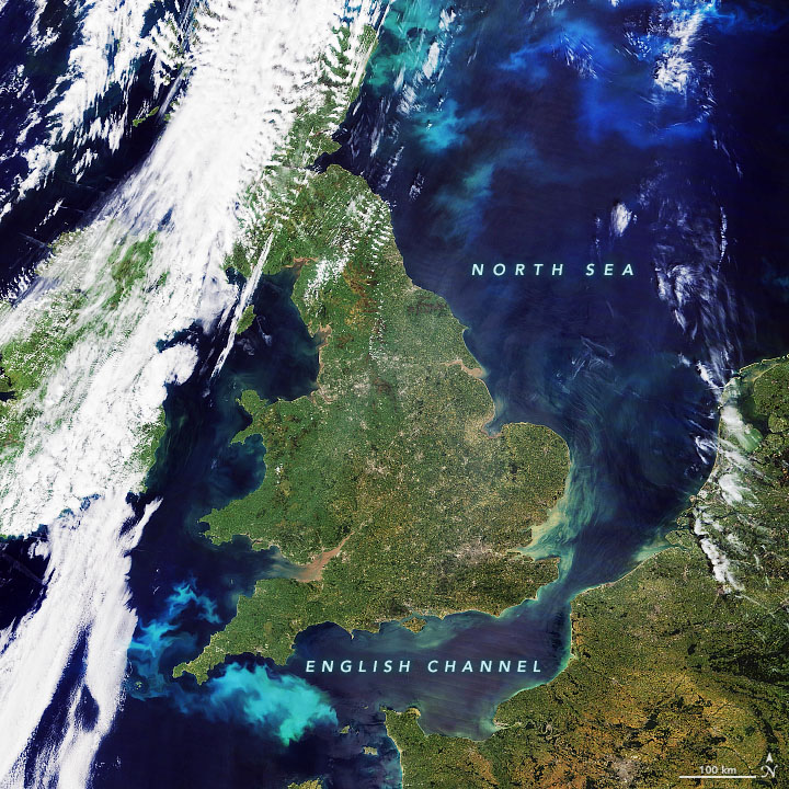 “In these latitudes, coccolithophores usually peak around the summer solstice, and they follow the spring diatom blooms,” said Barney Balch, a researcher at the Bigelow Laboratory for Ocean Sciences who studies phytoplankton. “They are probably of the species Emiliania huxleyi, common in those parts. Note that the nearby white cliffs of Dover contain massive amounts of coccoliths, deposited there over geological time.”