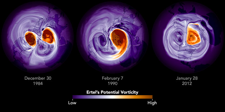 In the menacing face at the top of the page, a split in the vortex following a sudden stratospheric warming event left two areas of high potential vorticity serving as eyes, while an area of low potential vorticity formed the mouth. The face was seen in potential vorticity data from January 25, 1982, at a height of roughly 30 kilometers (18 miles), roughly the middle of the stratosphere.