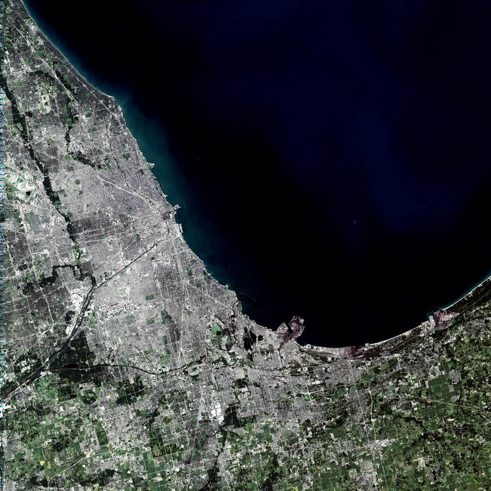 This simulated-color scene was acquired by the Landsat 7 Enhanced Thematic Mapper plus (ETM+) on September 14, 2001. Looking at the image, one can make out some of Chicago’s famous sites. The long black line coming into the center of the city from the southeast is the Chicago Sanitary and Ship Canal. In the center of the city, just right of where the canal banks north to become the Chicago River, sits a small pier on Lake Michigan, perpendicular to the city, known as Meigs Field. Just to the left of the pier is Soldier Field. Scanning north of Miegs Field, another pier juts out onto the lake. This is Navy Pier. Though it cannot be made out in the image, the Water Tower District and the John Hancock Building sit between Navy Pier and the Chicago River. South of this area is downtown Chicago and the Sears Tower.