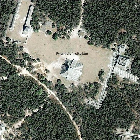 The 75-foot pyramid in the center of the site is the Pyramid of Kulkulkán, the Feathered Serpent God of the Maya. The Maya were obviously careful observers of the apparent change in the location of the Sun in the sky throughout the year; different parts of the pyramid are aligned with different seasonal solar occurrences, including the rising and setting of the Sun on the longest and shortest days of the year (solstices).