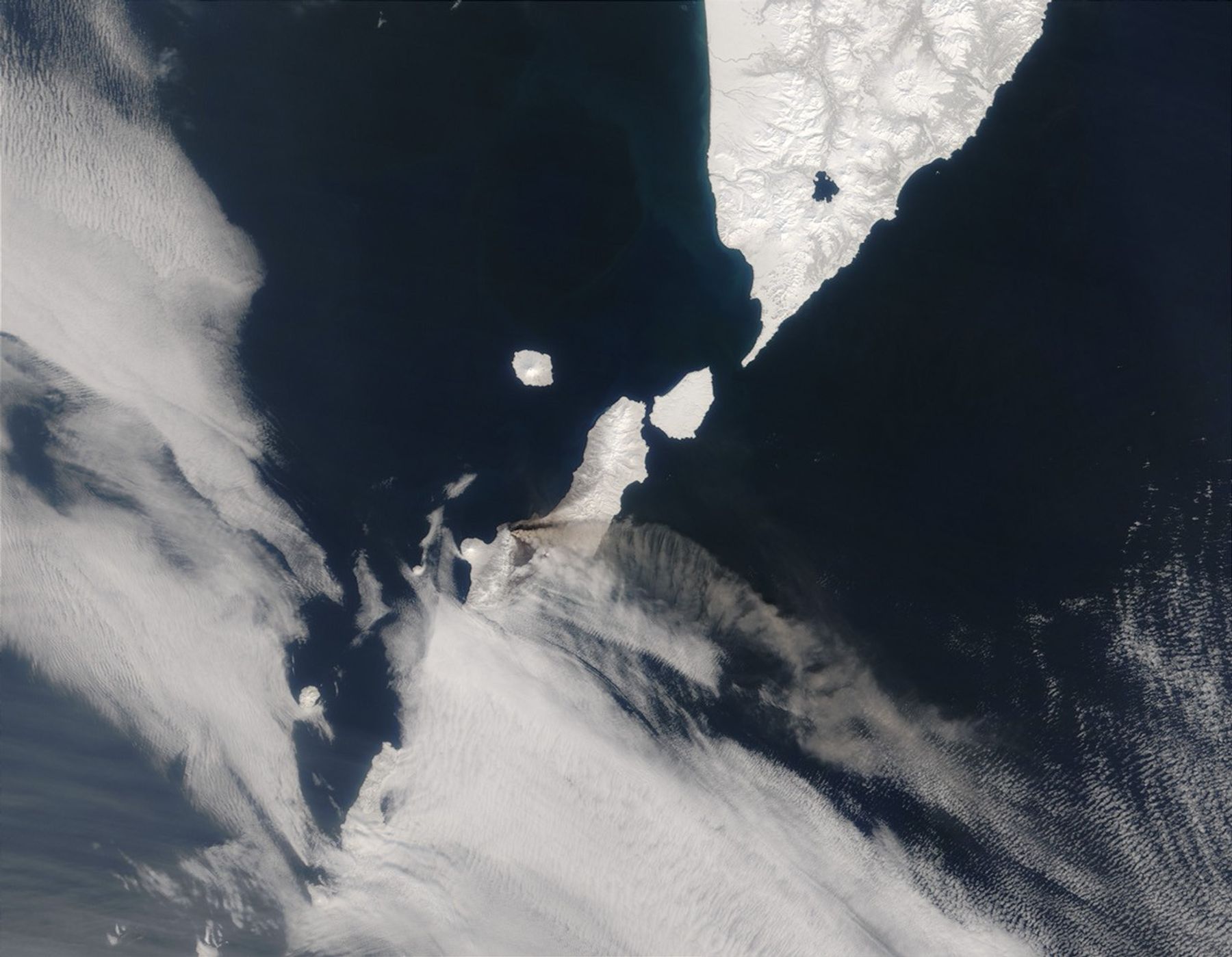 This true-color satellite image shows Russia’s Chikurachki Volcano sending a plume of ash streaming eastward over the North Pacific. At 1,816 meters (5,958 feet), Chikurachki is the tallest of the many volcanoes on Paramushir Island. Paramushir is part of the Kuril Island arc—a chain of volcanic islands stretching from the southern tip of Russia’s Kamchatka Peninsula to northern Japan.