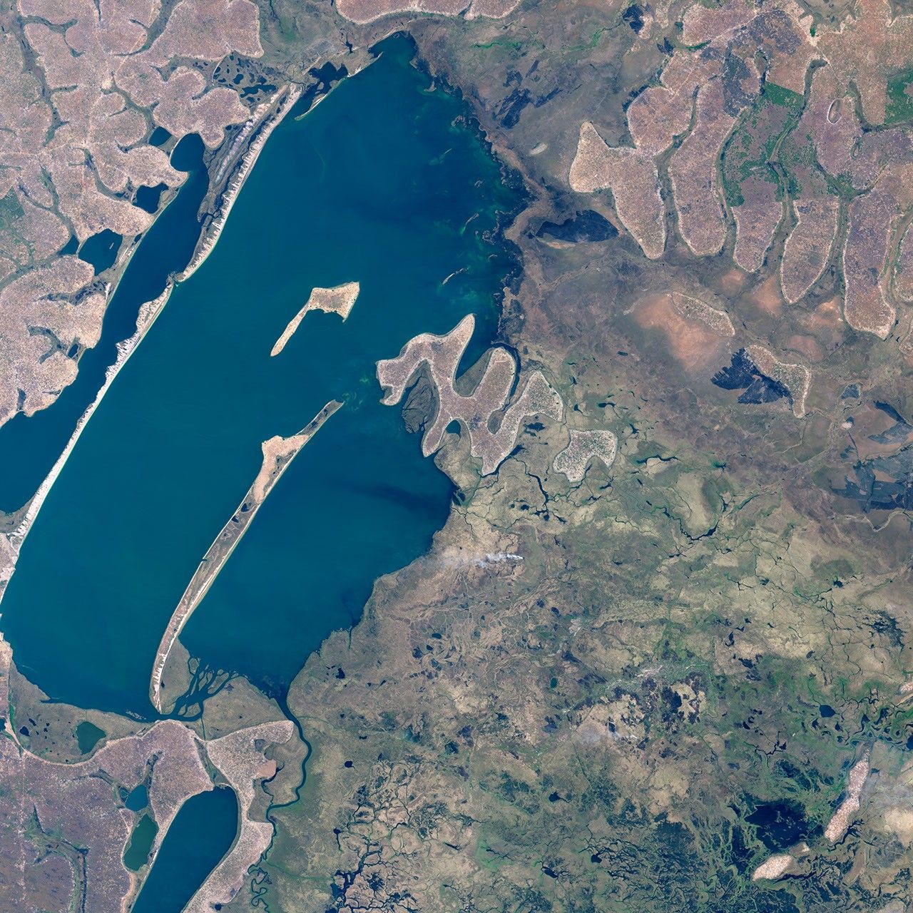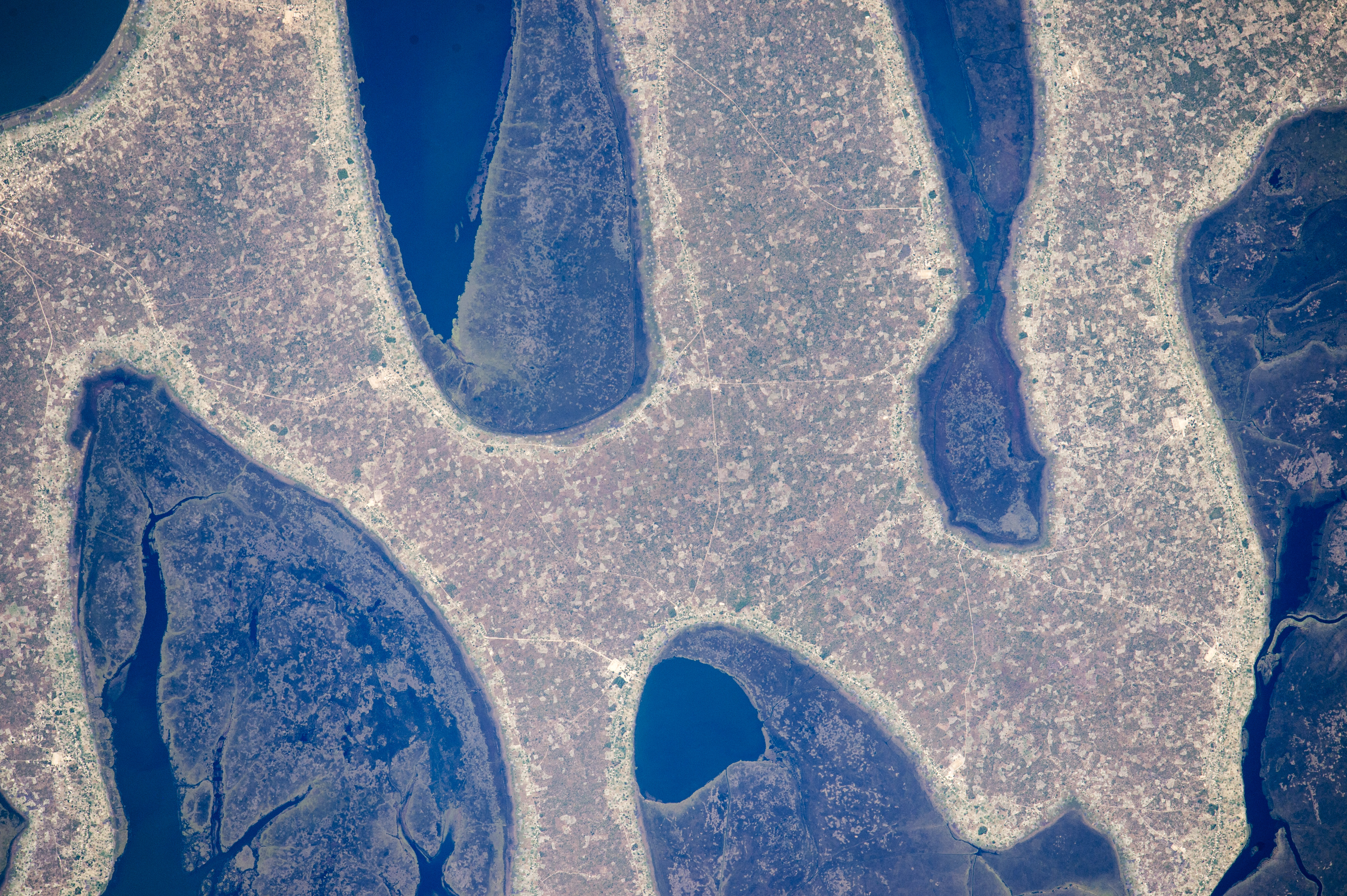 An astronaut aboard the International Space Station took this photograph of the strange rounded shapes along the coastline of Zambia’s Chilubi Island. The light-toned sand island stands out from the dark waters of Lake Bangweulu.