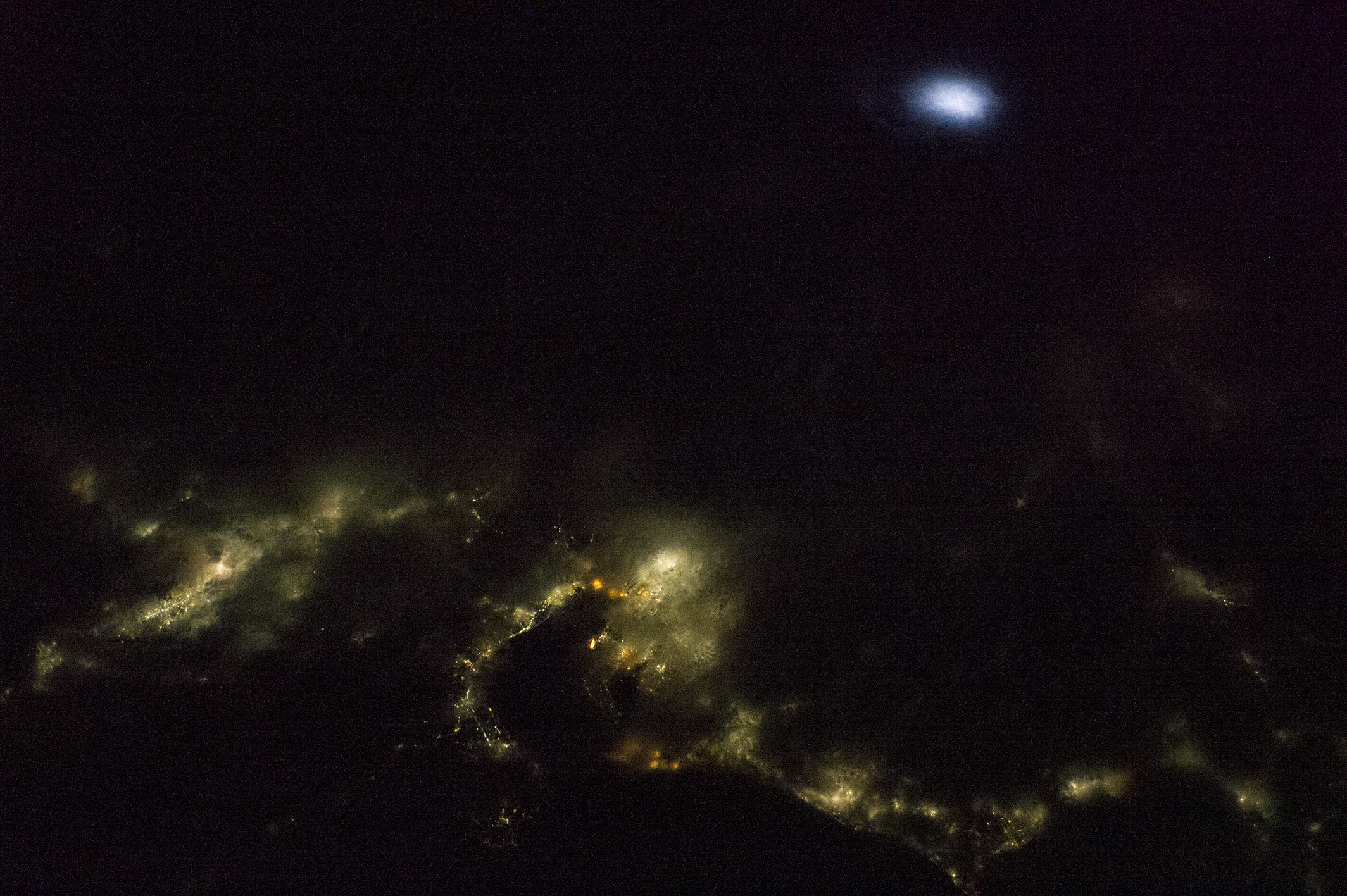 Astronauts captured this photograph of south-central Japan on August 16, 2014, as the space station was passing over the western Pacific Ocean. The brightest spot in the center of the photo is the port city of Nagoya, the third largest metropolitan area in Japan. To the left, the lights of the Osaka, Kyoto, and Wakayama urban areas pierce through clearings in the cloud cover. (Note that north is to the upper right in this image.) Much of the scene is obscured by cloud cover, though a lightning storm lights up the clouds to the north. Note how the lightning is much whiter than the yellow and orange hues of city lights.