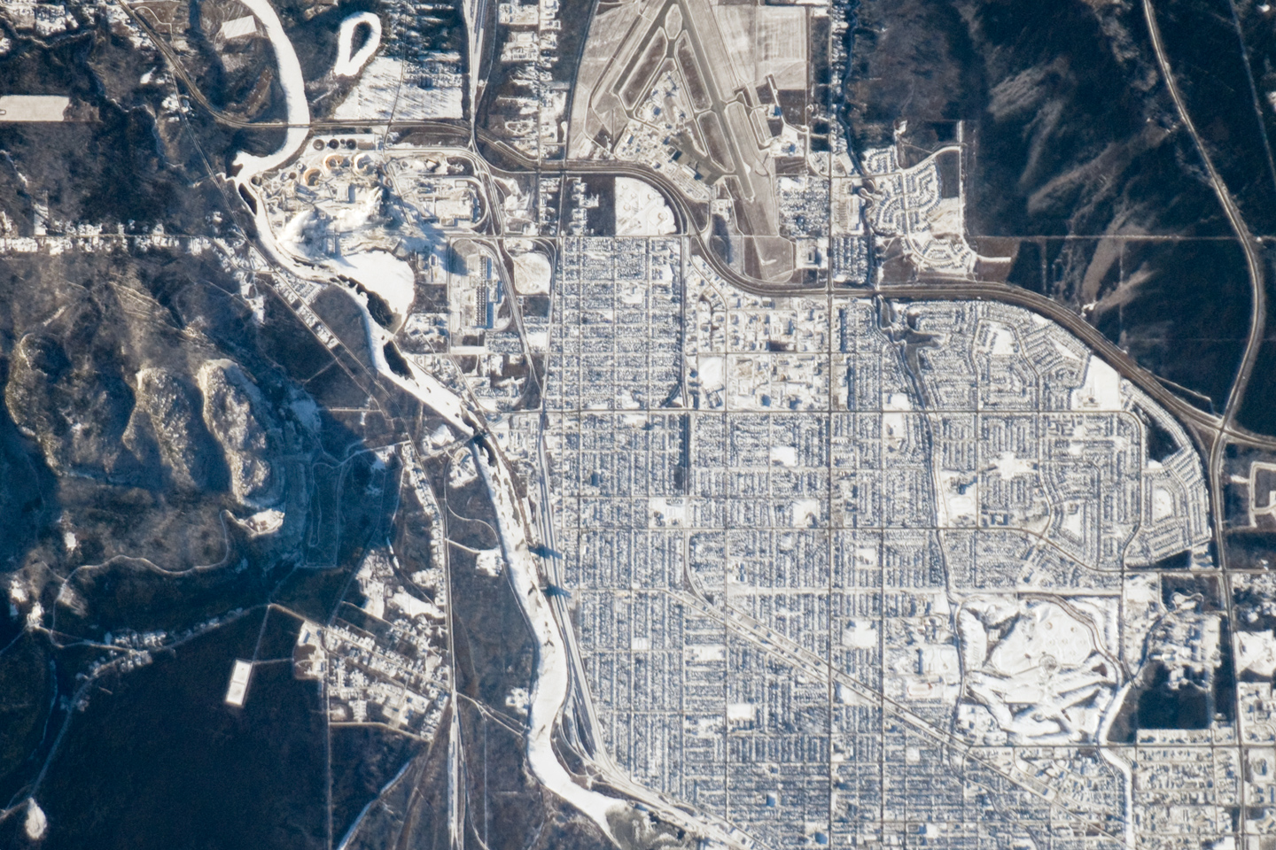 This detailed astronaut photograph is centered on the older city of Fort William, in the southern portion of Thunder Bay. Winter snows outline the street grid of the city, while parks appear as roughly rectangular areas of unbroken white snow. Built materials (buildings, streets) appear light gray, while vegetated areas and the rock outcrop near Mount McKay are dark green to dark gray. The Kam River to the south of Fort William is ice-covered, and has an even covering of snow that traces the river channel.