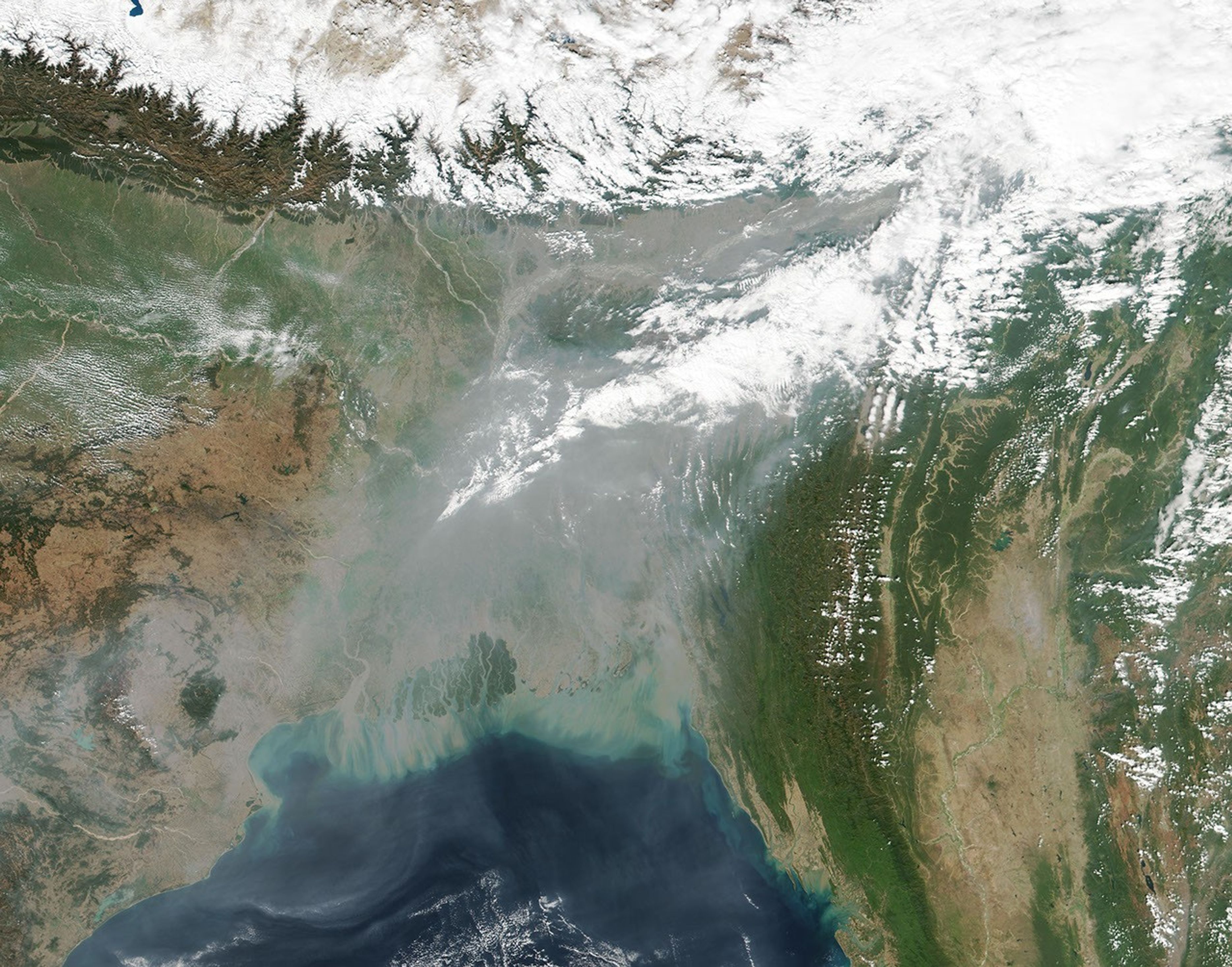 The Visible Infrared Imaging Radiometer Suite (VIIRS) on Suomi NPP captured this natural-color image of haze over Bangladesh on January 28, 2017. Cookstoves are a significant contributor to poor air quality in Bangladesh, particularly in the winter when meteorological conditions tend to trap pollution near the surface.