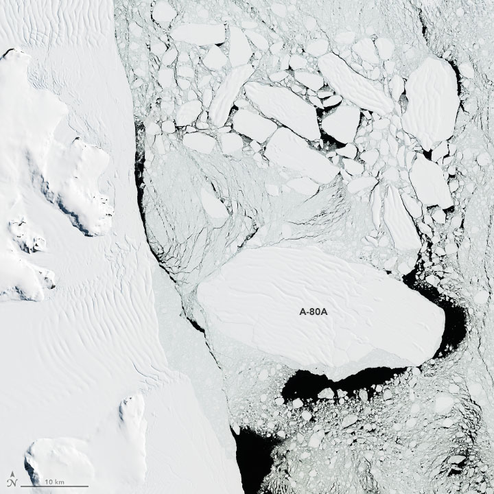 Christopher Readinger, an ice analyst at the U.S. National Ice Center (USNIC), used the European Space Agency’s Sentinel-1a satellite to confirm the break on November 27, 2022, and identified several icebergs that were at least 10 nautical miles long—large enough to be named and tracked by the USNIC. Iceberg A-80A was the largest, measuring about 19 kilometers (19 nautical miles) long and 17 kilometers (9 nautical miles) wide. It stayed that size through at least January 6, 2023.