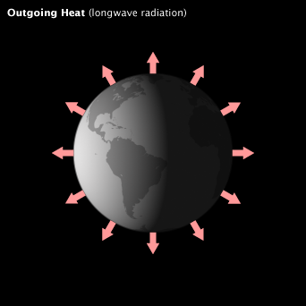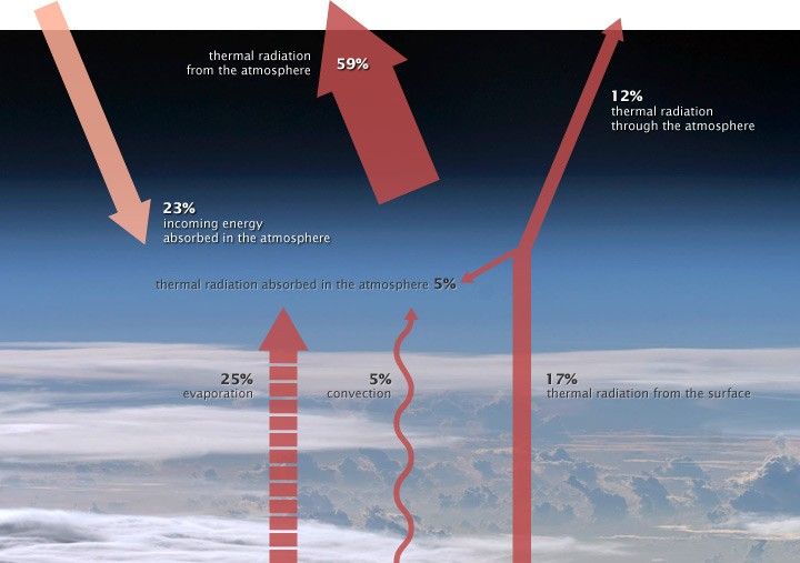 Just as the incoming and outgoing energy at the Earth’s surface must balance, the flow of energy into the atmosphere must be balanced by an equal flow of energy out of the atmosphere and back to space. Satellite measurements indicate that the atmosphere radiates thermal infrared energy equivalent to 59 percent of the incoming solar energy. If the atmosphere is radiating this much, it must be absorbing that much. Where does that energy come from?