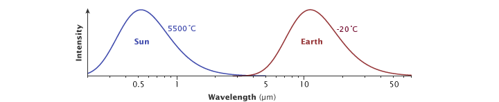Finally, a net of about 17 percent of incoming solar energy leaves the surface as thermal infrared energy (heat) radiated by atoms and molecules on the surface. This net upward flux results from two large but opposing fluxes: heat flowing upward from the surface to the atmosphere (117%) and heat flowing downward from the atmosphere to the ground (100%). (These competing fluxes are part of the greenhouse effect, described on page 6.) Remember that the peak wavelength of energy a surface radiates is based on its temperature. The Sun’s peak radiation is at visible and near-infrared wavelengths. The Earth’s surface is much cooler, only about 15 degrees Celsius on average. The peak radiation from the surface is at thermal infrared wavelengths around 12.5 micrometers.