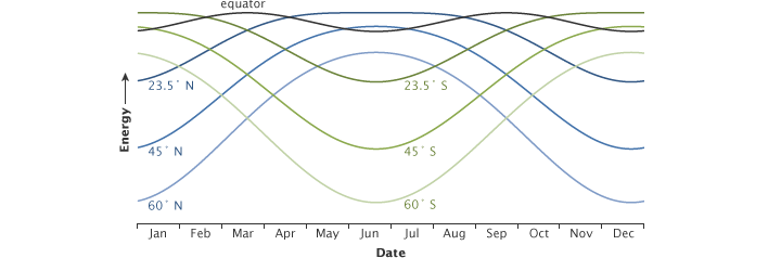 Three hundred forty watts per square meter of incoming solar power is a global average; solar illumination varies in space and time. The annual amount of incoming solar energy varies considerably from tropical latitudes to polar latitudes (described on page 2). At middle and high latitudes, it also varies considerably from season to season.