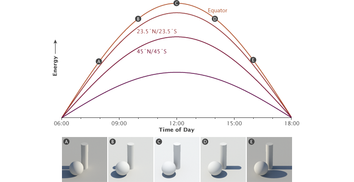 In addition, the total solar irradiance is the maximum power the Sun can deliver to a surface that is perpendicular to the path of incoming light. Because the Earth is a sphere, only areas near the equator at midday come close to being perpendicular to the path of incoming light. Everywhere else, the light comes in at an angle. The progressive decrease in the angle of solar illumination with increasing latitude reduces the average solar irradiance by an additional one-half.