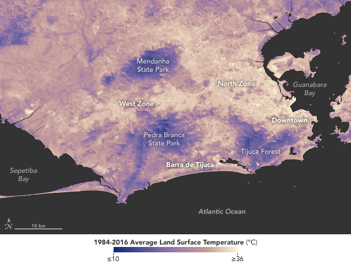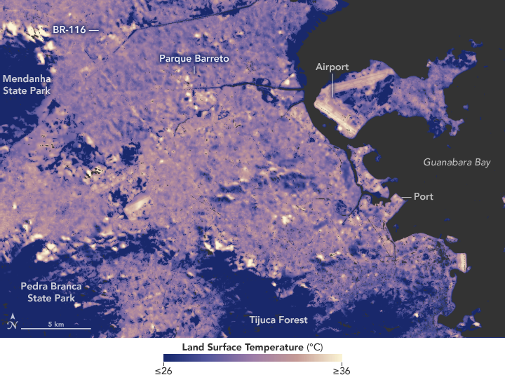 According to a climate change adaptation report from the city government, average air temperatures in Rio have increased by about 0.05 degrees Celsius per year in recent decades. As part of a partnership with NASA’s Earth Science Division, city leaders are working to better understand and adapt to the heat. Planners are using publicly available temperature data from NASA satellites to help devise ways of “climate-proofing” the city from rising temperatures and natural disasters.