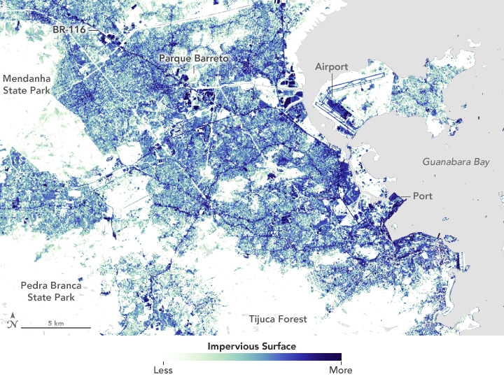 The map at the top of this page shows surface temperatures in Rio’s North Zone on August 26, 2016. The measurements are derived from observations made by the Thermal Infrared Sensor (TIRS) and Operational Land Imager (OLI) on Landsat 8. The coolest areas are blue and light purple; warmer areas are pink and white. The second map shows where impervious surfaces—buildings and roads that are impenetrable to water—are concentrated. Blue areas have lots of impervious surfaces; white areas have few. The third map (below) shows average land surface temperatures over a broader area as observed by Landsat 5, 7, and 8 between 1984–2016.