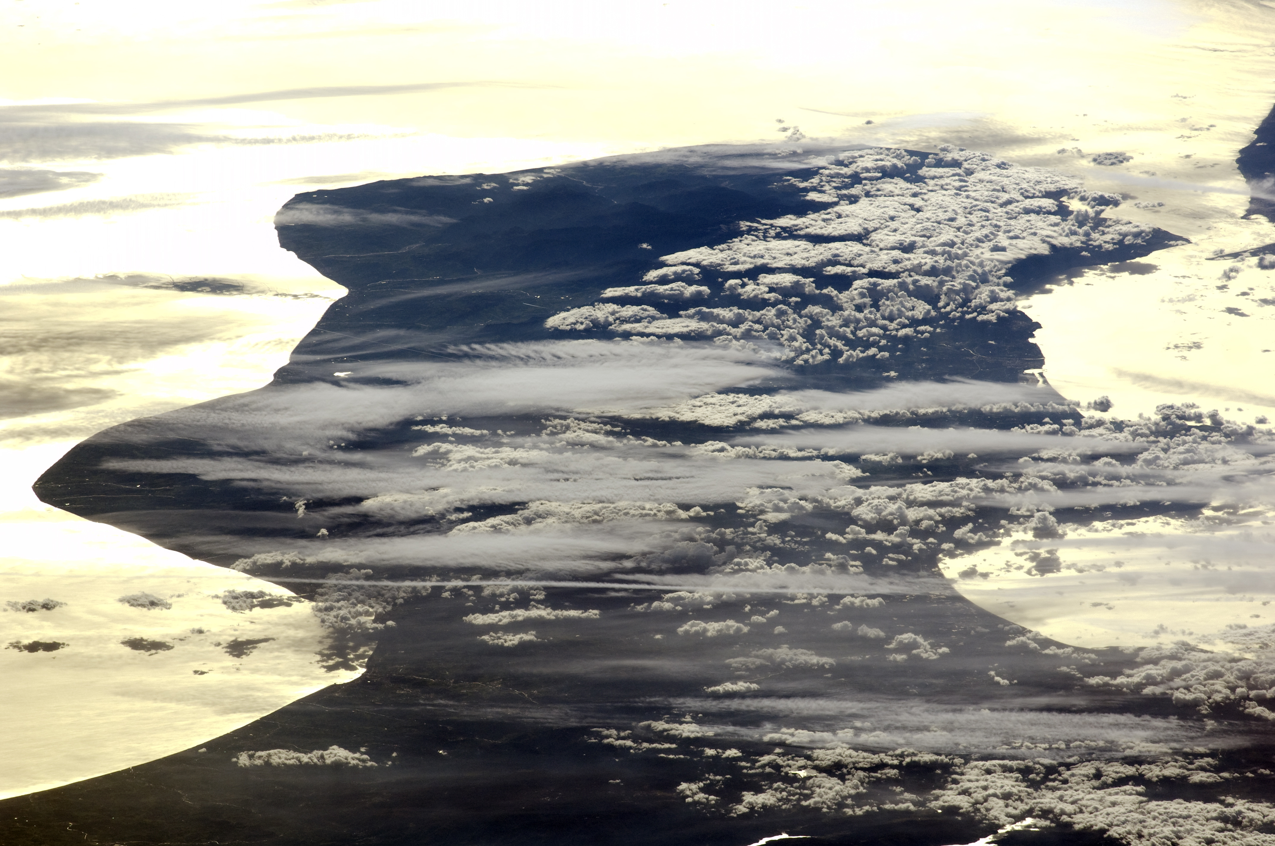 The Calabrian Peninsula appears shortened and distorted due to the extreme sideways viewing angle from the ISS. Such a perspective is termed oblique, as opposed to a nadir view, in which the astronaut is looking directly downwards towards the Earth’s surface from the ISS. This highly oblique view also highlights two distinct cloud patterns over the Calabrian interior. Patchy, highly textured cumulus clouds are present at lower altitudes, while grey altostratus clouds are stretched out by prevailing winds at higher altitudes. The Strait of Messina, just visible at image upper right, marks the boundary between the coastline of Italy and the island of Sicily.