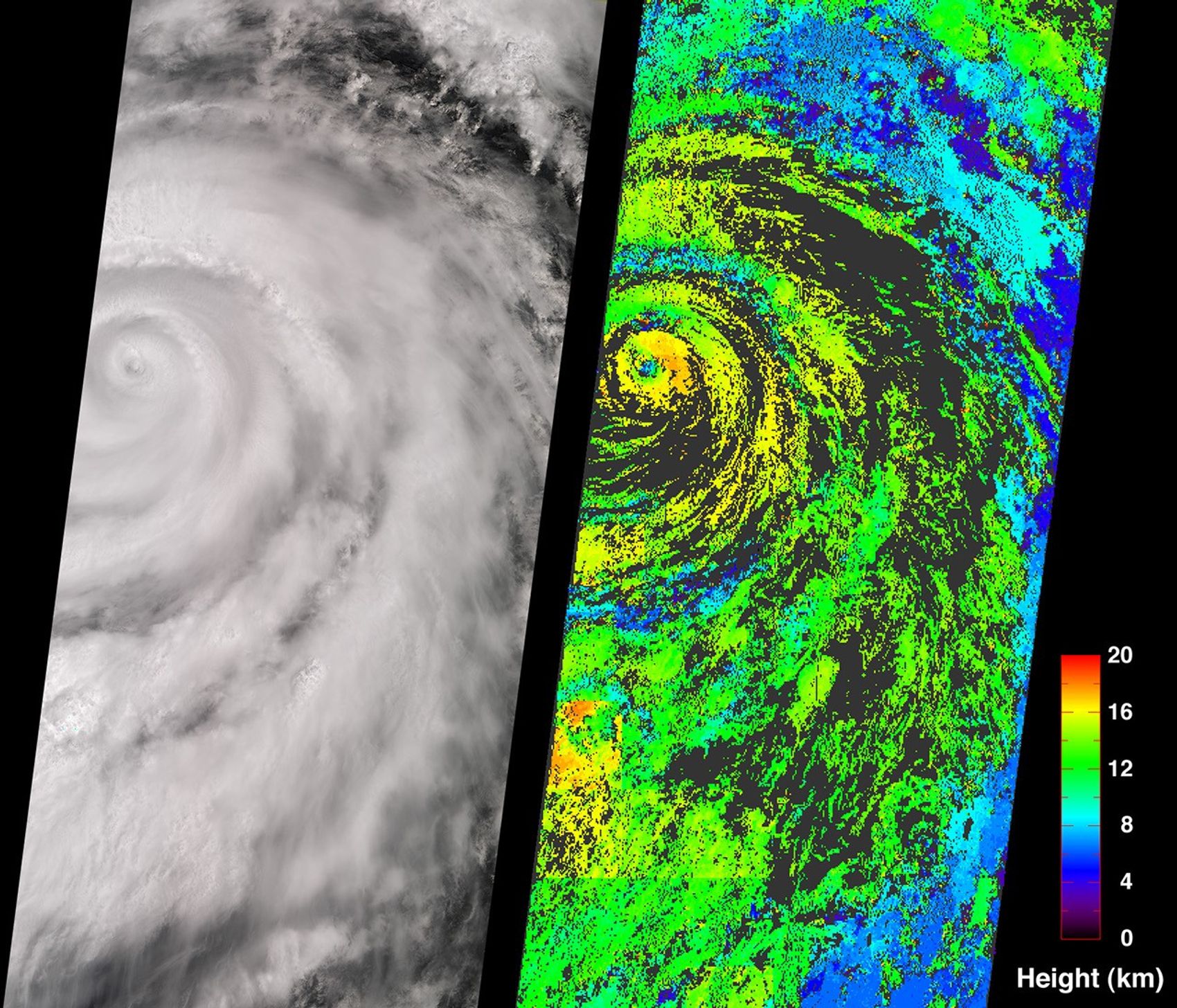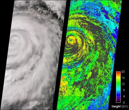 On the left is a true-color image produced by MISR’s nadir(vertical-viewing) camera. Impressive spiral arms wrapped around the eyeare apparent. Several areas of convective cloud can be discerned alongthe arms. The eye of the storm is centered at 18.8N latitude and 109.8Wlongitude (about 480 kilometers south of Cabo San Lucas, Mexico). On theright is the cloud-top height field derived using automated computerprocessing of the data from multiple MISR cameras. Relative heightvariations are well represented, such as the clearing within the storm’seye. The stereoscopic data processing algorithm used to generate theseresults is still being refined. Future versions of this product may showmodest changes in the height values compared to the preliminary valuesdisplayed here. Areas where heights could not be retrieved are shown indark gray. The observations cover a 380-kilometer swath width.