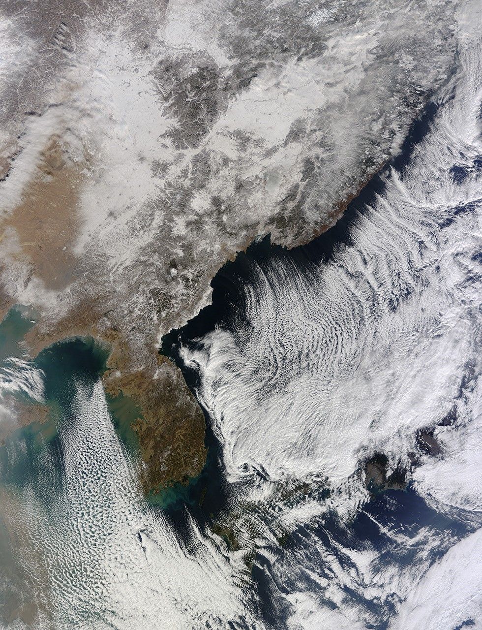 Cool weather in eastern Asia also spurred an outbreak of cloud streets over the Sea of Japan recently. On January 9, 2014, MODIS captured this view (below) of cloud streets spurred by northwesterly winds. On that day, the high temperature in Vladivostok, Russia, was 10°F (-12°C) and the low was -7 °F (-21°C).