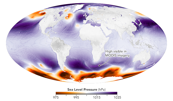 The global map above shows the position of the high-pressure area on April 3, 2022, about 90 minutes before the MODIS image of the cloud “hole” was acquired. Globally, the average sea-level pressure is about 1013 millibars; at the center of the high, pressures topped 1,035 millibars. Stormy, low-pressure areas appear orange; calmer, high-pressure areas are purple.