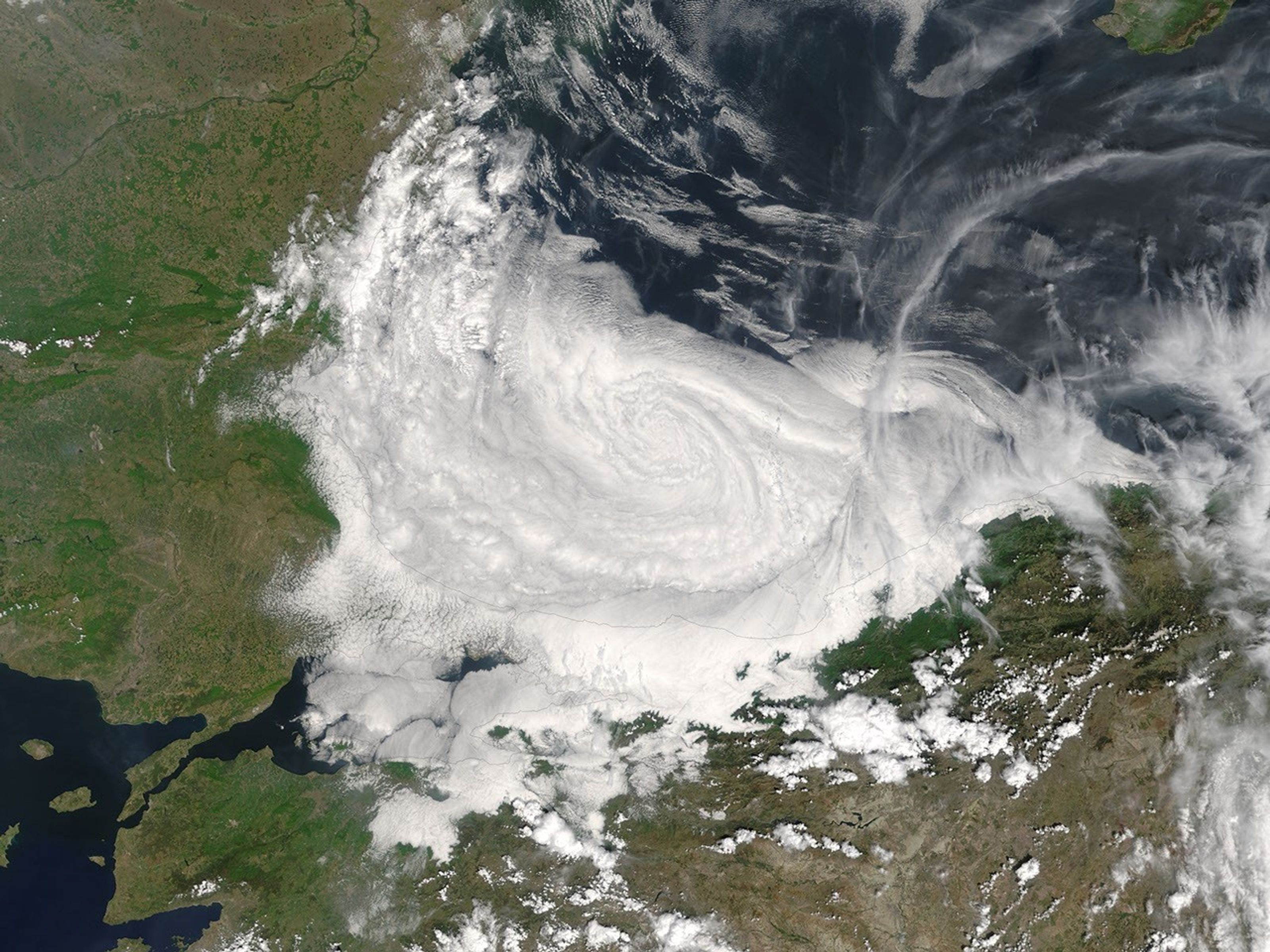 The atmosphere is a dynamic place, as is illustrated by clouds over the southwestern Black Sea in this true-color image from May 3, 2004. At the lowest level, thick white clouds are caught in a swirling air current, which causes the clouds to take on this spiral pattern. At a higher altitude, wispy clouds ride air currents moving independently of lower ones. This is especially noticeable on the right side side of the image.
