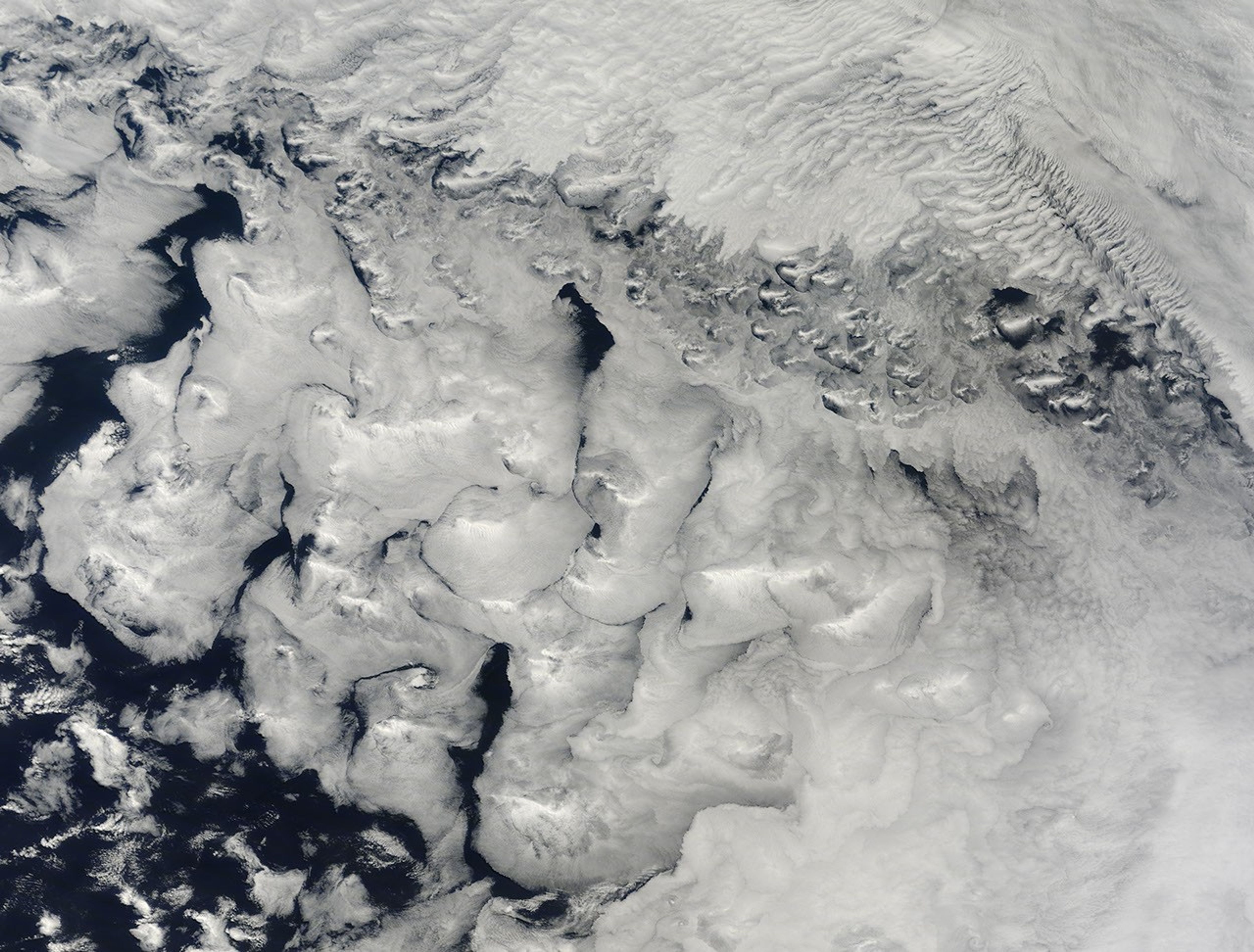 The natural-color image was captured by the Moderate Resolution Imaging Spectroradiometer (MODIS) on NASA’s Terra satellite on November 30, 2011. According to Patrick Minnis, a cloud expert at NASA’s Langley Research Center, there are at least three layers of clouds in the image.