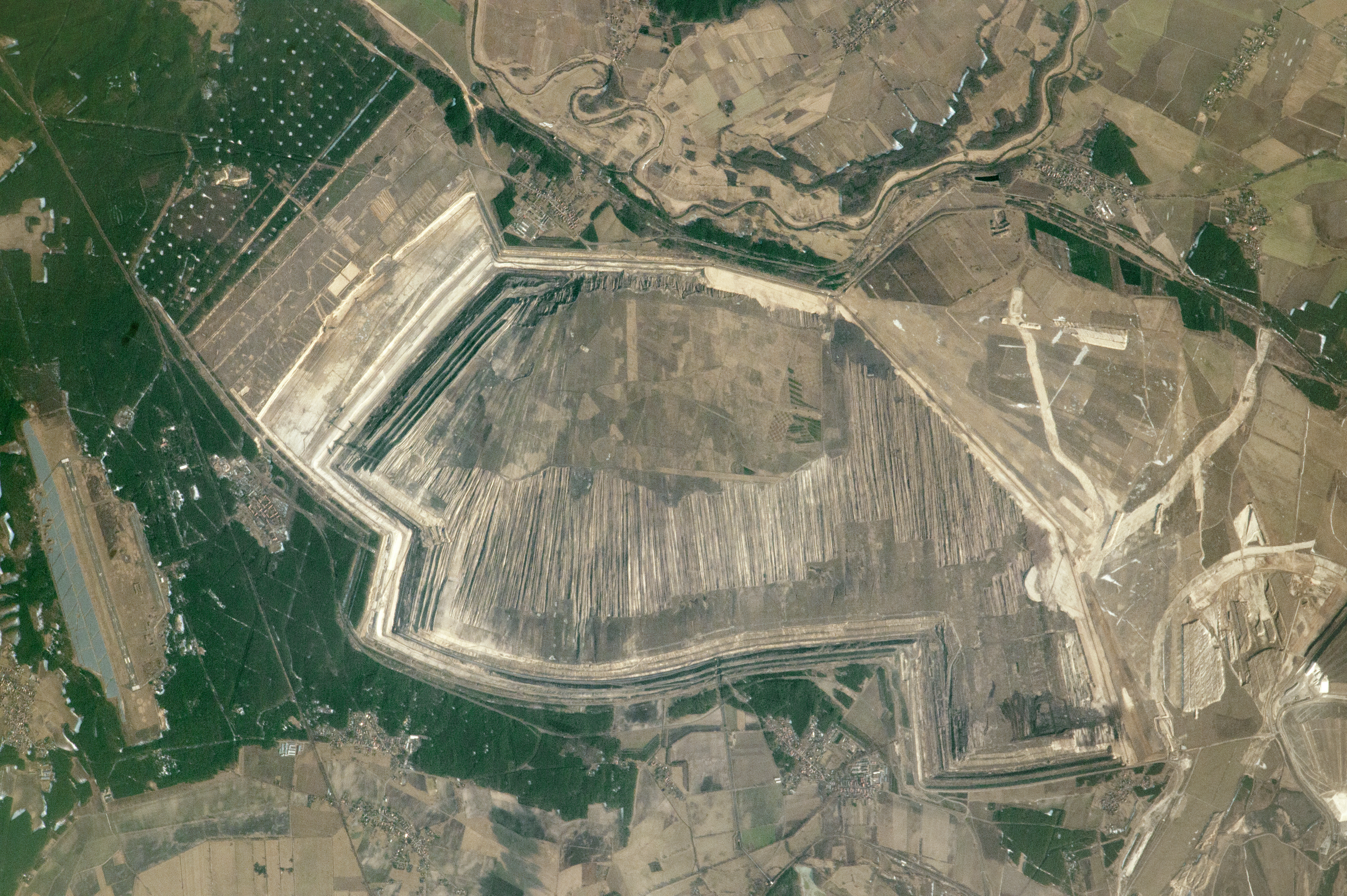 An astronaut on the International Space Station took this photograph of a strip mine in Germany, located along the Polish border at the Neisse River (Nysa in Polish). Here lignite, also known as soft brown coal, is being mined in large quantities to supply one of Germany’s largest power stations near the village of Jänschwalde.