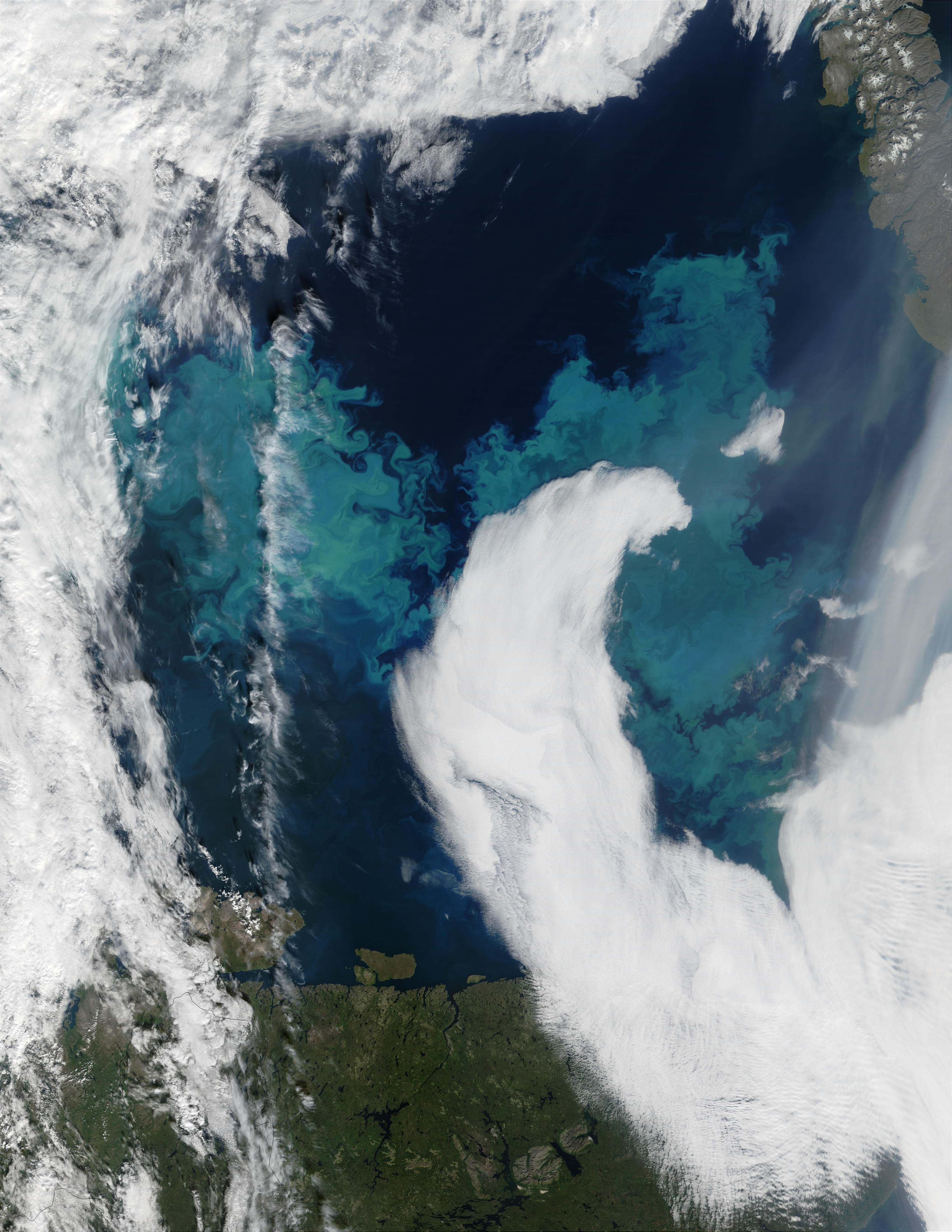 The Barents Sea features a striking coccolithophore bloom in this image acquired August 22, 2002, by the Moderate Resolution Imaging Spectroradiometer (MODIS) on the Terra satellite. The Barents Sea, considered a part of the Arctic Ocean, is bordered by Franz Josef Land in the north (top left corner, obscured by clouds), Novaya Zemlya in the east (top right corner), and Svalbard in the west (not visible). The Barents Sea is warmed by the North Atlantic Drift, which helps to leave a number of ports in the Sea ice-free all year long.
