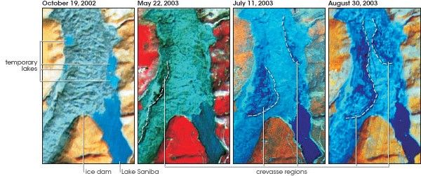Throughout the remainder of 2002 and into the late spring of 2003, frequent fogs and dangerous weather conditions prevented on-site visits or aerial photography of the glaciers, so the IRS satellite data that were collected periodically by Research and Development Center ScanEx in Moscow became the key method for monitoring the glaciers and lakes. The three scientists were relieved to observe the lakes began to disappear one by one, likely draining through channels and crevasses appearing in the ice mass. By summer 2003, only three of the original 13 remained.