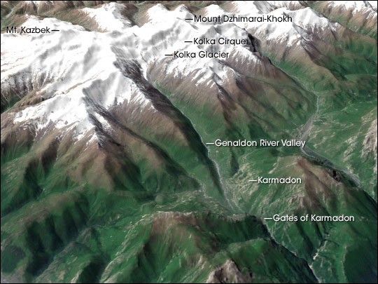 On the evening of September 20, 2002, in a cirque just west of Mt. Kazbek, chunks of rock and hanging glacier on the north face of Mt. Dzhimarai-Khokh tumbled onto the Kolka glacier below. Kolka shattered, setting off a massive avalanche of ice, snow, and rocks that poured into the Genaldon River valley. Hurtling downriver nearly 8 miles, the avalanche exploded into the Karmadon Depression, a small bowl of land between two mountain ridges, and swallowed the village of Nizhniy Karmadon and several other settlements.