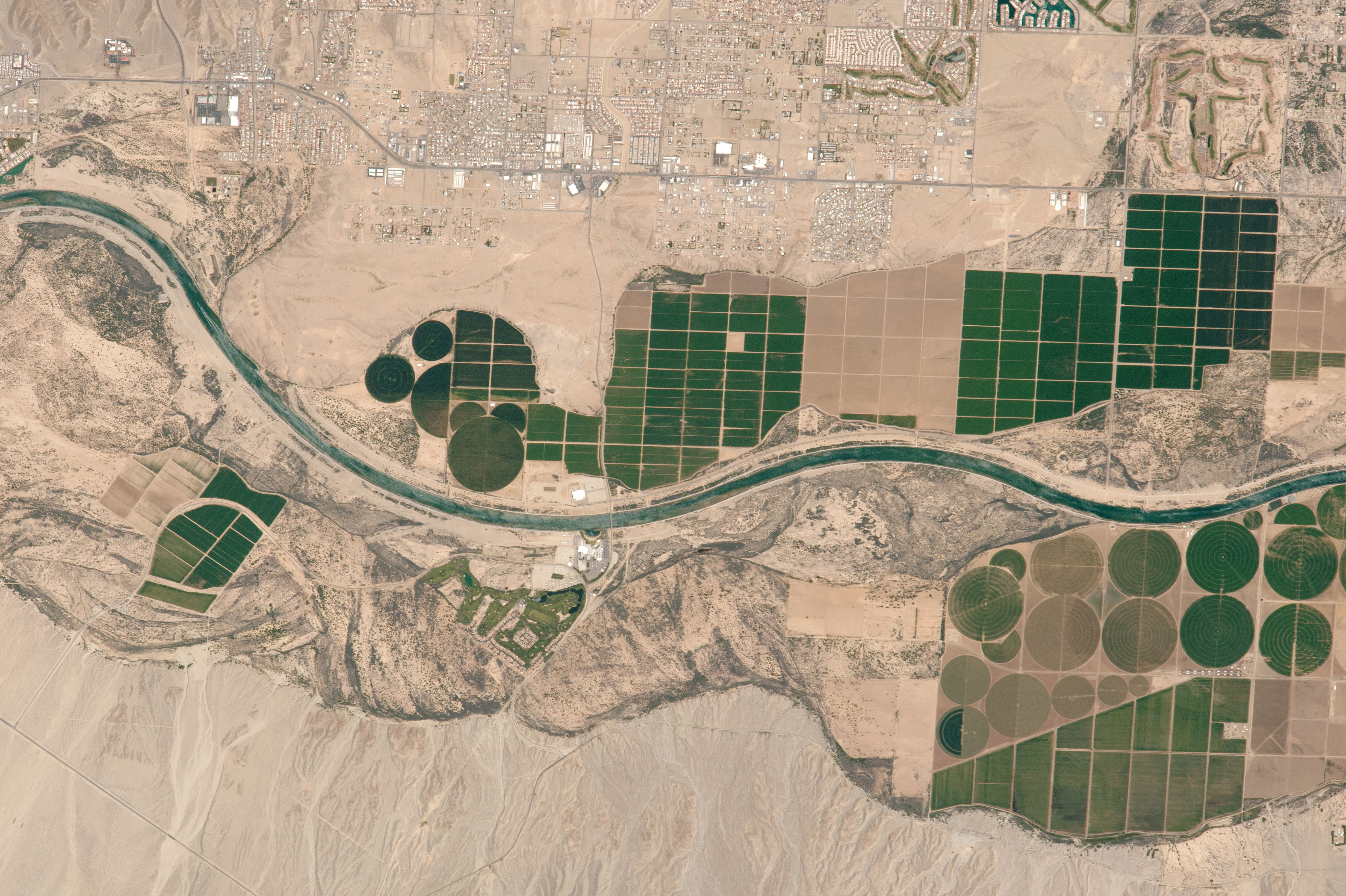 Looking down on the desert vistas of the southwestern United States, an astronaut took this photograph of a short section of the Colorado River. This reach of the river is marked by dark-toned agricultural fields, both rectangular and round, restricted to the narrow zone of arable land on the floodplain close to the river. For scale, the larger crop circles are 750 meters in diameter. Note that from the astronaut’s perspective here, north is to the left.