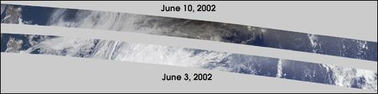 In this Advanced Spaceborne Thermal Emission and Reflection Radiometer (ASTER) image, acquired Sunday, June 16, 2002, at 10:30 a.m. MST, the dark blue area is charred vegetation and the green areas are healthy vegetation. Red areas are active fires, and the blue cloud at the top center is smoke. Standard clouds are white, and in the morning sunlight they are casting black shadows on the ground to their north and west. The image covers an area 32.2 kilometers wide by 35.2 kilometers tall (20.0 x 21.8 miles), and ASTER channels 8-3-2 in red, green, and blue are displayed.