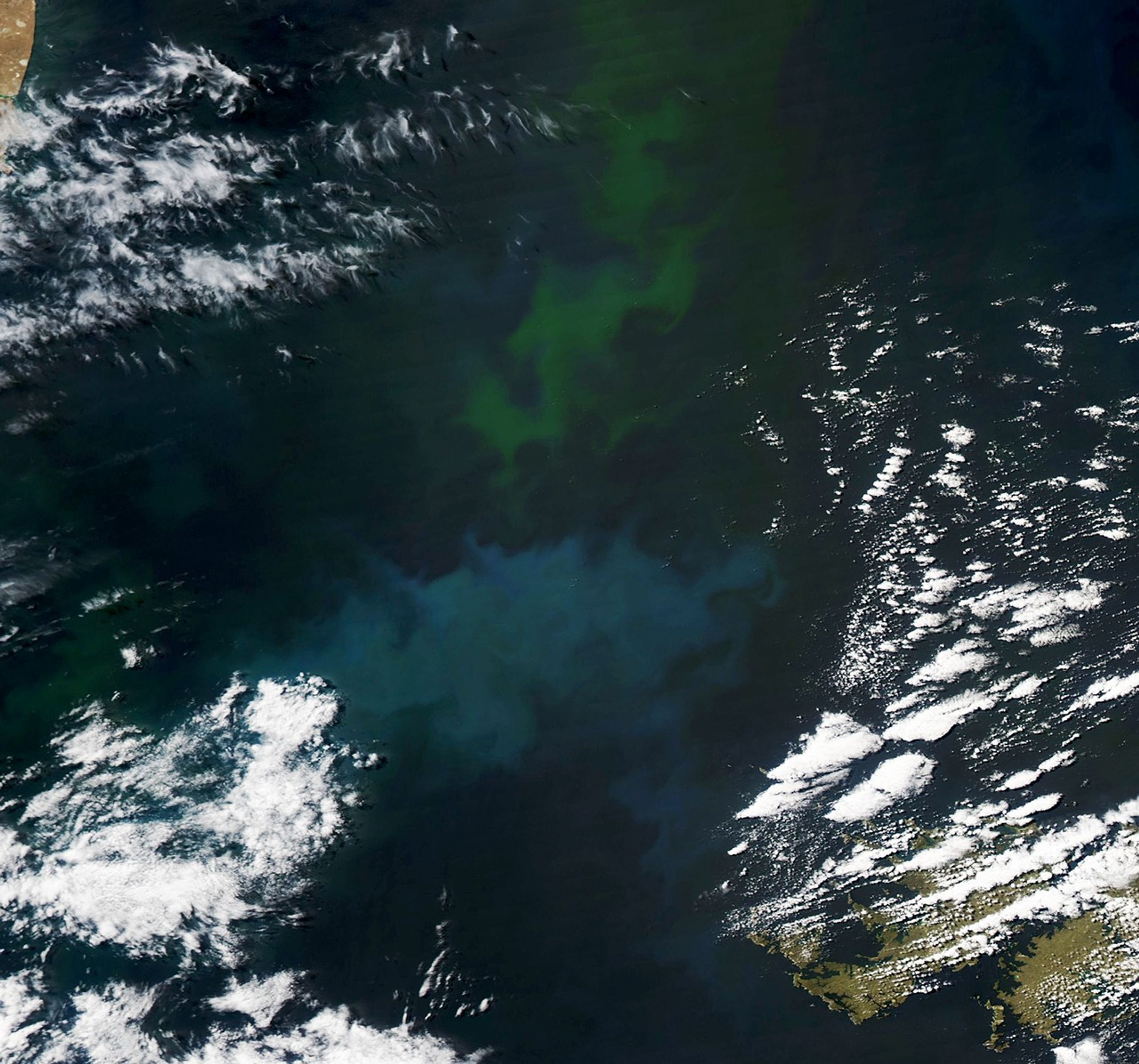 The patches of color not only reveal the presence of phytoplankton, but also trace the edges of the dynamic eddies and currents that carry them. Off the coast of Argentina, Uruguay, and Brazil, warm currents from the tropics flow south and run into cooler currents flowing north from the Southern Ocean. They meet in a place known as the Brazil-Malvinas Confluence. At least seven different water masses of varying temperature, depth, and salinity arrive at this turbulent intersection, leading to vertical and horizontal mixing. With all of the churning—plus nutrient-rich outflows from rivers (such as Rio de la Plata) and windblown dust from Patagonia—this patch of ocean is incredibly productive and home to one of the richest fisheries in the world.