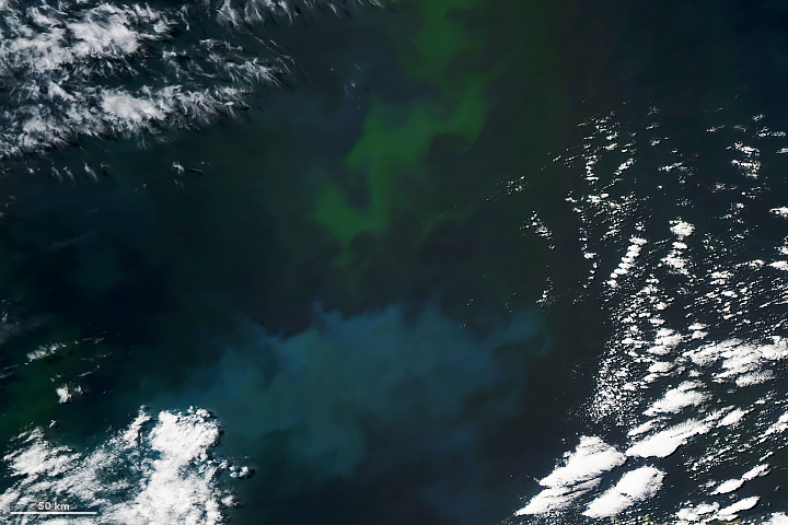 It is not possible to detect specific species from space, but the aquamarine stripes and swirls are likely coccolithophores—phytoplankton with microscopic calcite shells that give water a chalky color. The various shades of green are probably diatoms, dinoflagellates, and related species. Ship-based studies have shown that Emiliania huxleyi coccolithophores and Prorocentrum sp. dinoflagellates tend to dominate in this region. Imagers planned for future satellite missions should make it easier to identify types of phytoplankton from space.