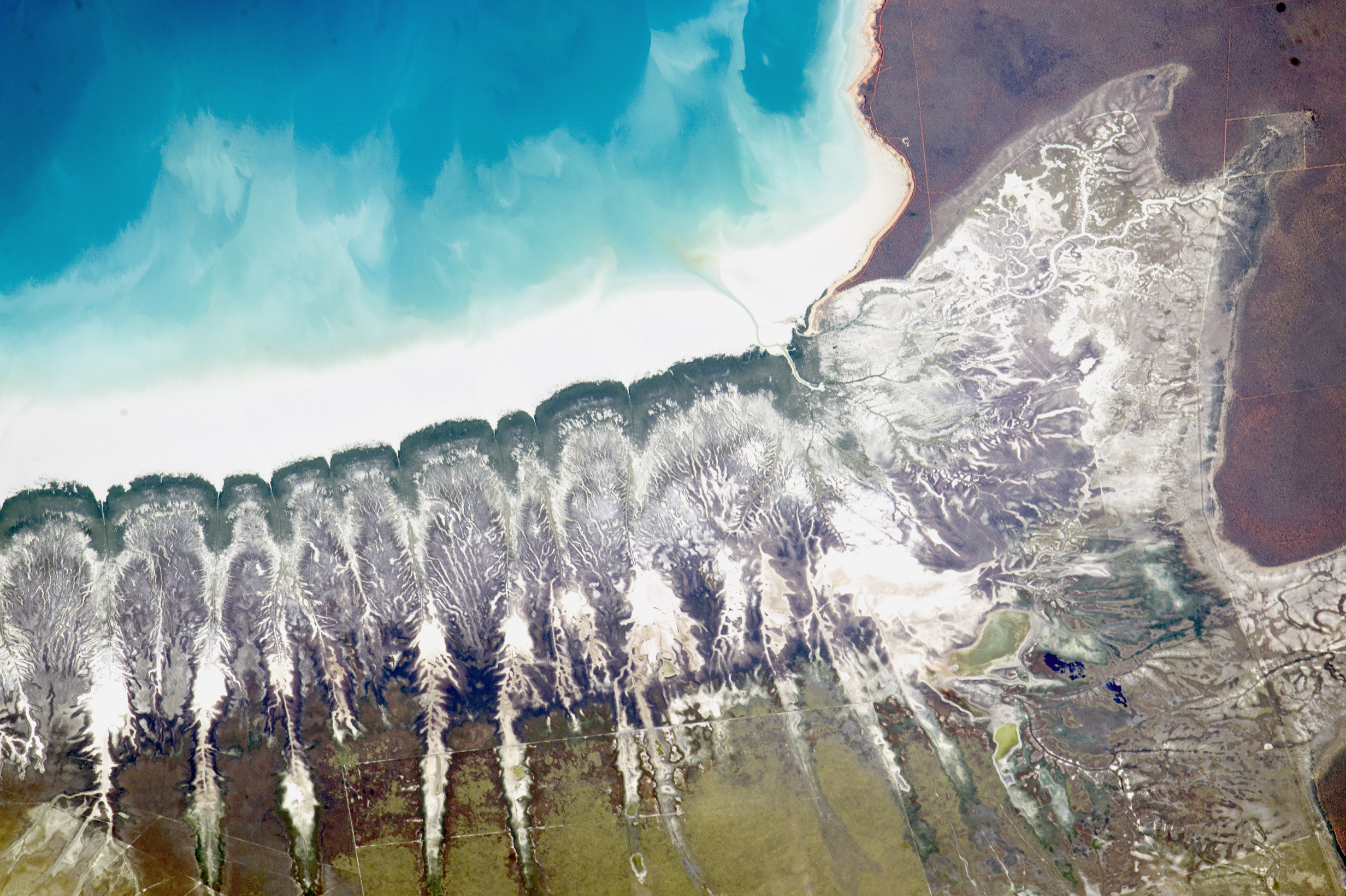 This photograph taken from the International Space Station shows striking shoreline patterns at Roebuck Bay, on the coast of the desert landscape of Western Australia. The indents along the shoreline (center and left) are points where small, straight streams reach the bay. Even smaller tributaries give a feathered appearance to this shoreline. By contrast, the more typical meandering channel patterns of coastal wetlands appear on the top right.