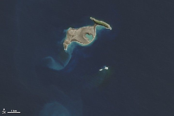 The images above were acquired by the Operational Land Imager (OLI) on the Landsat 8 satellite. The top image shows the area on December 2, 2013, one year prior to the eruption. At that point, the small islands of Hunga Tonga (right) and Hunga Ha’apai (left) were separated by the South Pacific Ocean. The second image shows the same area on April 28, 2015, four months after the eruption—and the first time that Landsat got a cloud-free view.