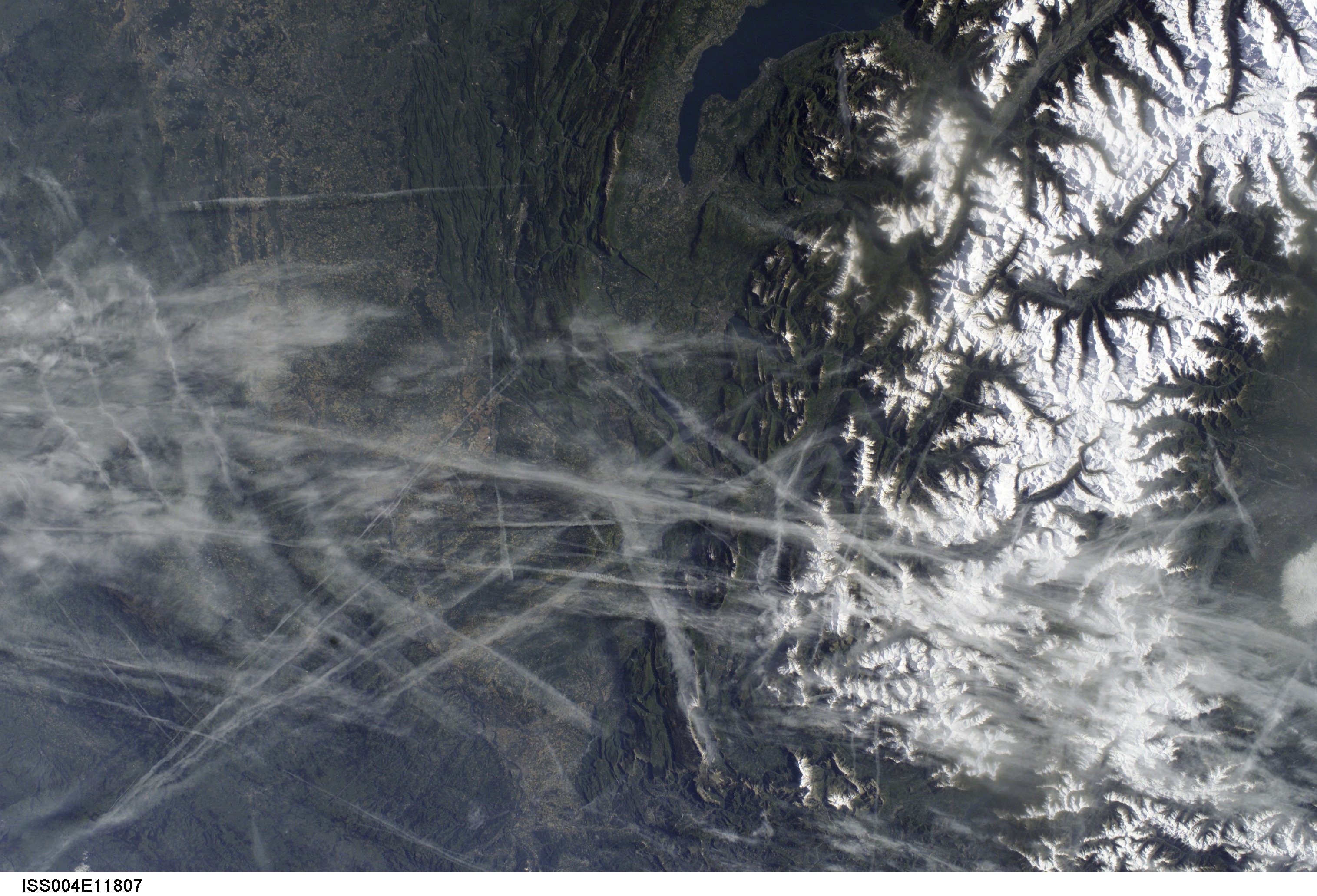 This digital photograph taken through the windows of the International Space Station on May 15, 2002, shows condensation trails over the Rhône Valley in the region west of Lyon. Condensation trails—or contrails—are straight lines of ice crystals that form in the wake of jet liners where air temperatures at altitude are lower than about 40°C.