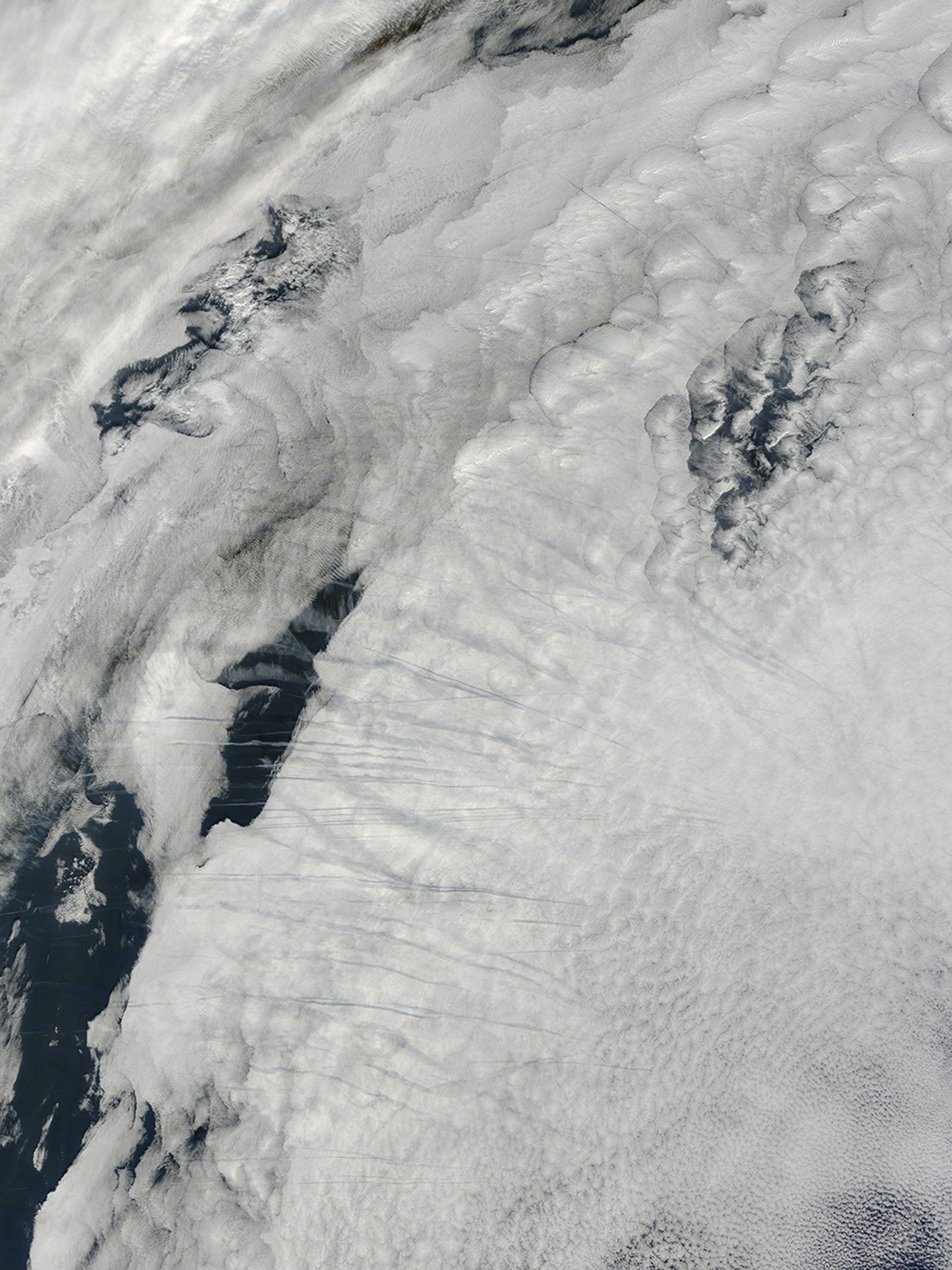 High-altitude aircraft leave behind condensation trails, or contrails, which form when extra water vapor is injected into the atmosphere through the aircraft's exhaust. On February 9, 2015, the Moderate Resolution Imaging Spectroradiometer (MODIS) on NASA’s Terra satellite captured this image of contrails above clouds over the North Atlantic Ocean.