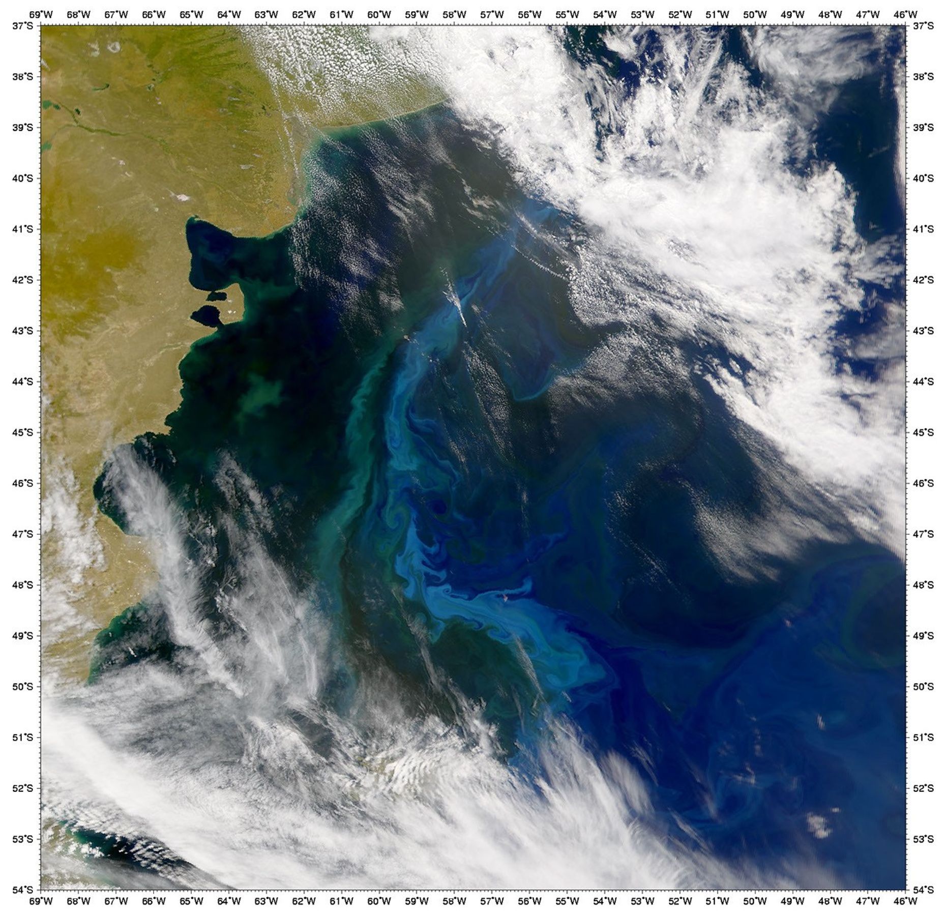 The bright waters off the east coast of Argentina mark the convergence of the Malvinas and Brazil Currents. The interaction of the two currents brings nutrients from the dark ocean depths to the sunlit surface, resulting in dense blooms of phytoplankton, especially in the spring and early summer.