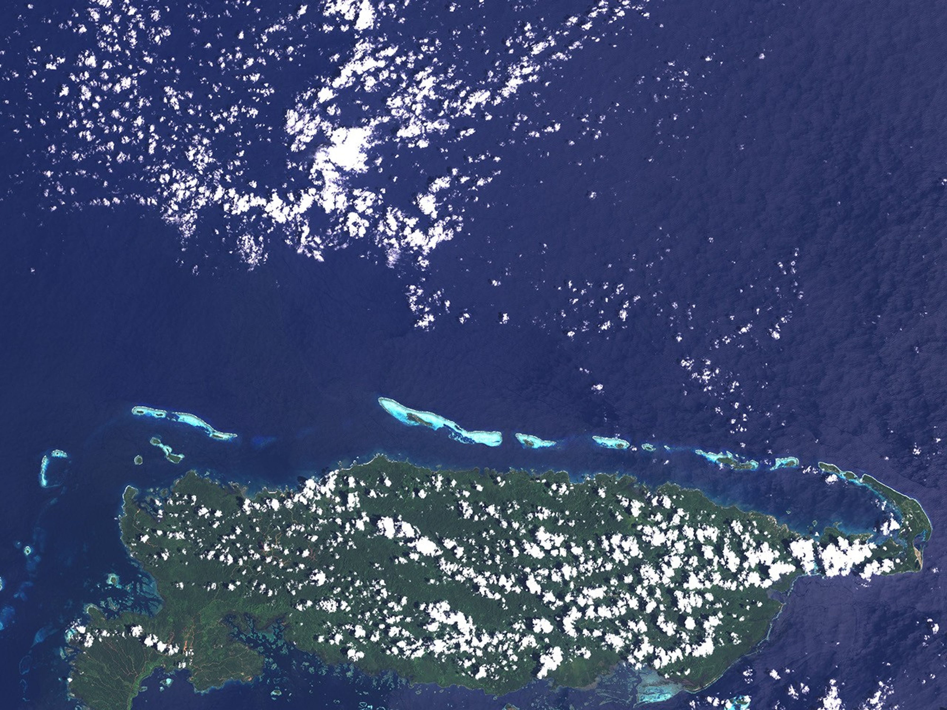 Ahus Island lies in the Admiralty Islands chain off the northern coast of Papua New Guinea, roughly 30 kilometers from the provincial capital, Lorengau. The Enhanced Thematic Mapper Plus (ETM+) instrument on NASA’s Landsat satellite captured this true-color image of Ahus Island on February 20, 2000. In this image, coral reefs stand out from their surroundings because of their shallower waters, shown in aquamarine. Exposed or shallow reefs at the reef edges tend to cause ocean waves to break, showing white foam as the cresting waves appear. White puffy clouds appear throughout the scene. The dense green forests on Manus Island contrast sharply with the dark blue of deep ocean and the aquamarine color of shallow areas. In the large format image, roads in the hills of Manus Island appear in brown and generally follow the tops of ridges.