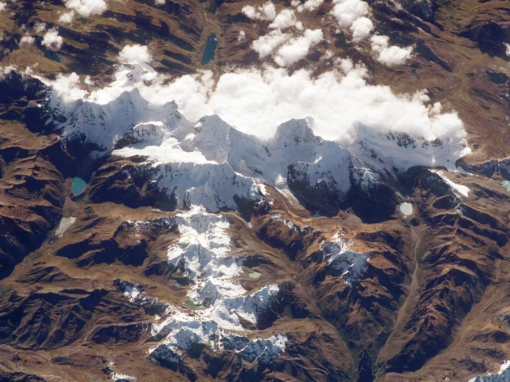 This astronaut photograph was taken looking east as the International Space Station was flying about 100 kilometers (about 62 miles) off the Peruvian coast and shows Cordillera Huayhuash (pronounced “Why-wash”). Clouds are banked up on the east side, snow covers all higher slopes and mountain peaks, and glaciers occupy lower slopes. This prominent but short mountain range (25 kilometers in length) boasts twenty peaks of remarkable steepness and ridge sharpness. Although only 100 kilometers from the coastline, six of the peaks reach above 6,000 meters (more than 19,500 feet); the highest is Nevado Yerupajá, Peru’s second highest peak, variously estimated as 6,617 and 6,635 meters high.
