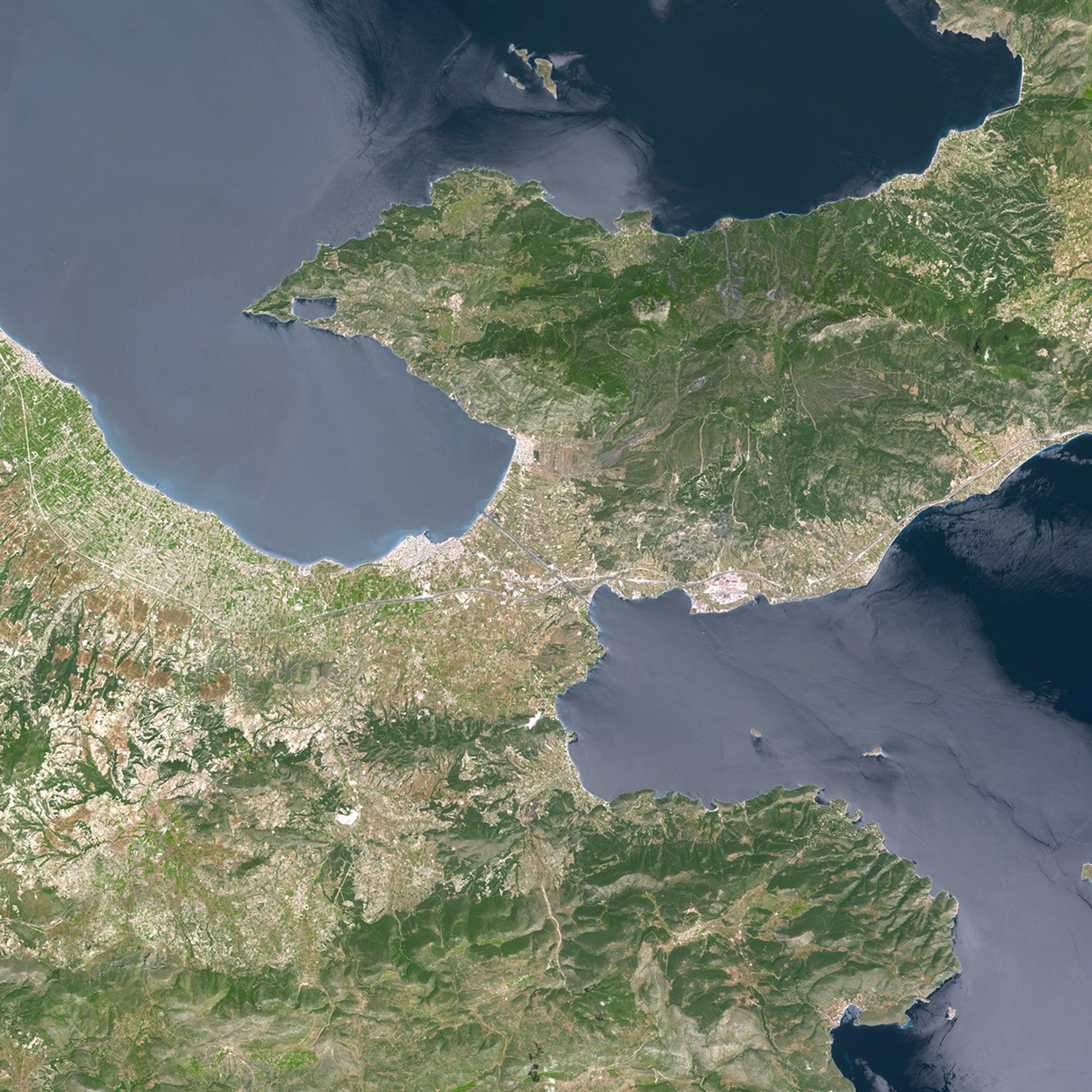On May 9, 2005, the Advanced Spaceborne Thermal Emission and Reflection Radiometer (ASTER) on NASA’s Terra satellite took this picture of the Corinth Canal and the surrounding area. The canal itself appears as a razor-thin blue strip running diagonally through the isthmus. On either side of the canal, straight lines and sharp lines indicate an urbanized environment, dissected by the occasional meandering highway. Corinth is south of the canal, while the port city Loutraki is to the north. Farther away from the canal, both north and south, the terrain turns more rugged and mountainous. Dark green indicates thicker vegetation, compared to the fairly sparse vegetation of the heavily populated areas. Hugging the coastline is a pale strip of blue, likely resulting from very shallow water and perhaps some sediment runoff. The seawater appears fairly pale in general in this image, and that may result from sunglint, where the Sun’s light bounces off the ocean’s surface and directly back into the satellite sensor’s field of view.