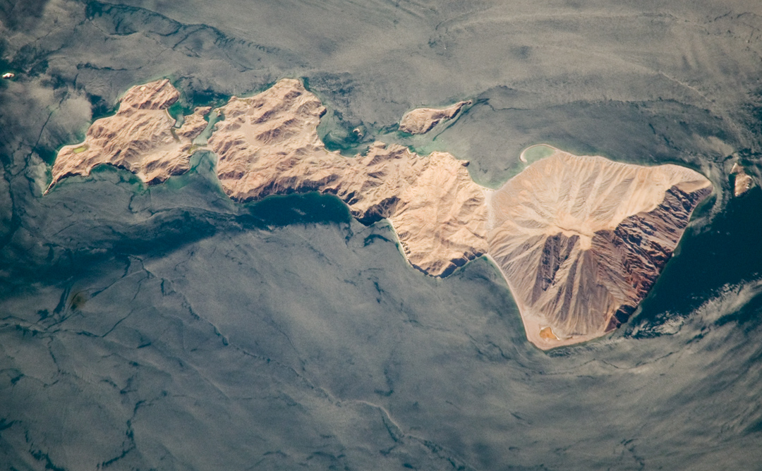 Today, the uninhabited island is a refuge with a rich marine assemblage, especially when compared to other, unprotected parts of the Gulf. This image provides hints of the diverse marine environment around the island. Most of the coast is steep and rocky, but lighter blue lagoons, especially along the western coast, provide shallower, protected environments that are biologically robust. Offshore, internal waves and complex surface currents facilitate mixing of the water, important for nutrient delivery to the coastal environments. These water patterns are outlined by sunglint (light reflecting off of the water surface back towards the camera onboard the International Space Station). The sunglint patterns are due to wind and currents, which roughen the water surface and enhance reflection, and surfactants that decrease the surface tension and roughness, resulting in regions of dark, smooth water.