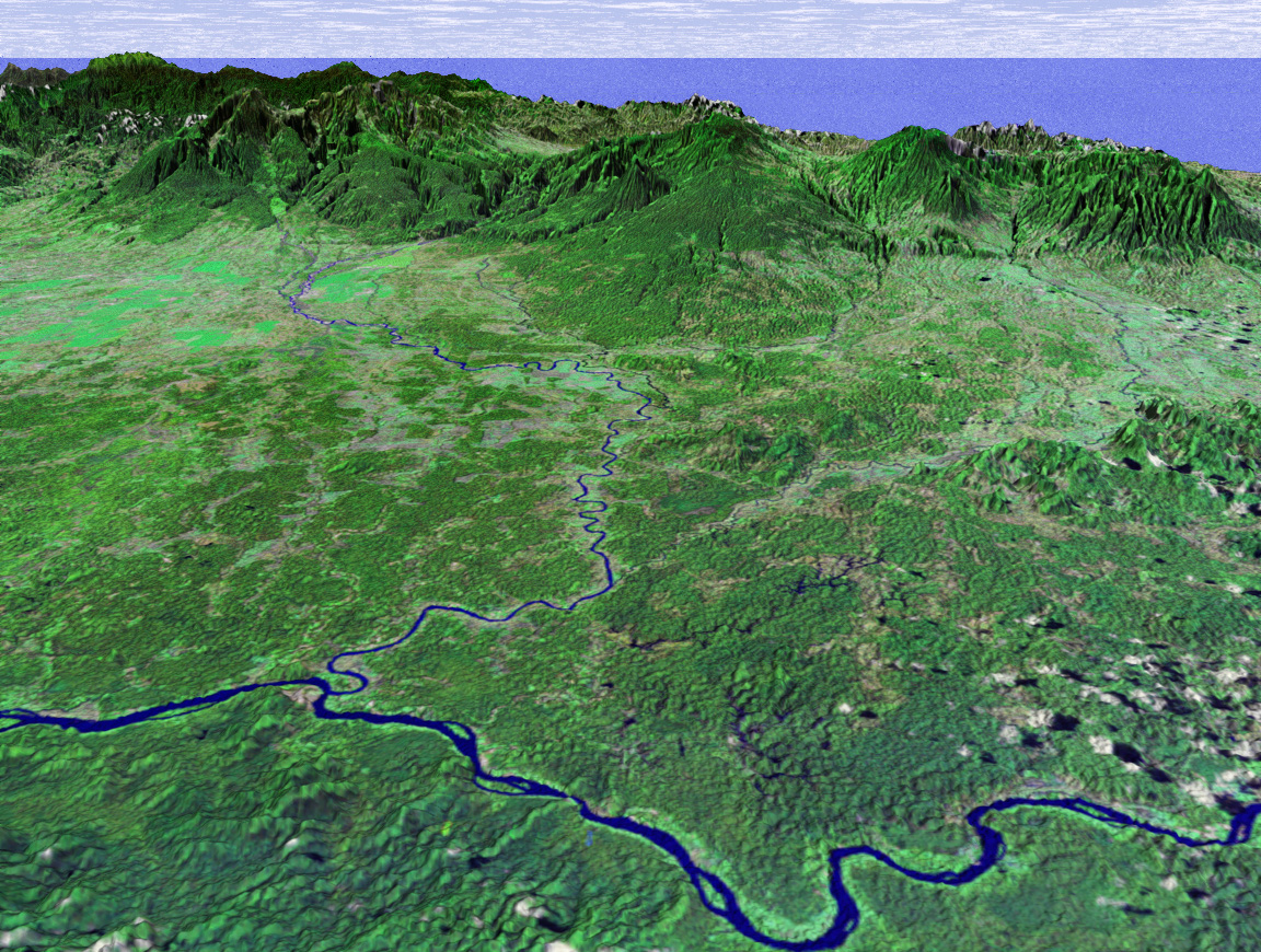 This perspective view shows the northern coastal plain of Costa Rica with the Cordillera Central, composed of a number of active and dormant volcanoes, rising in the background. This view looks toward the south over the Rio San Juan, which marks the boundary between Costa Rica and Nicaragua. The smaller river joining Rio San Juan in the center of the image is Rio Sarapiqui, which is navigable upstream as far inland as Puerto Viejo (Old Port) de Sarapiquí at the mountain’s base. This river was an important transportation route for those few hardy settlers who first moved into this region, although as recently as 1953 a mere three thatched-roof houses were all that comprised the village of Puerto Viejo.