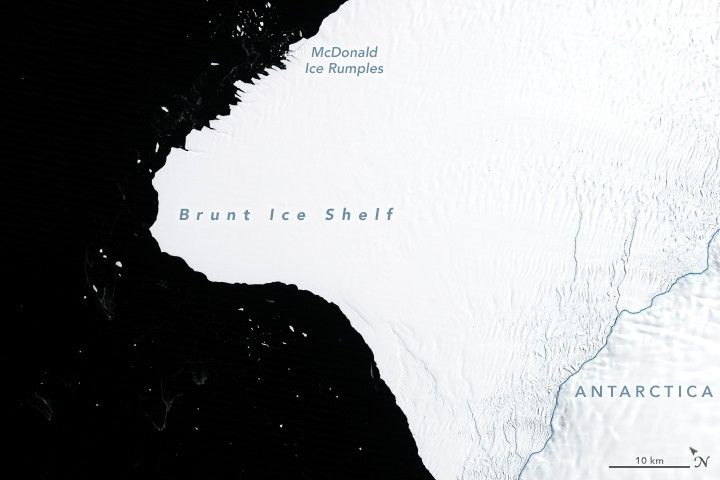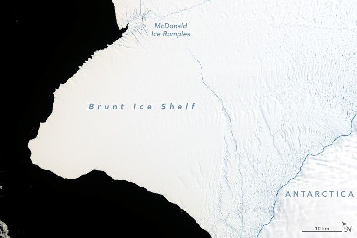 The detailed view shows this northward expanding rift coming within a few kilometers of the McDonald Ice Rumples and the Halloween crack. When it cuts all the way across, the area of ice lost from the shelf will likely be at least 1700 square kilometers (660 square miles). That’s not a terribly large iceberg by Antarctic standards—probably not even making the top 20 list. But it may be the largest berg to break from the Brunt Ice Shelf since observations began in 1915. Scientists are watching to see if the loss will trigger the shelf to further change and possibly become unstable or break up.