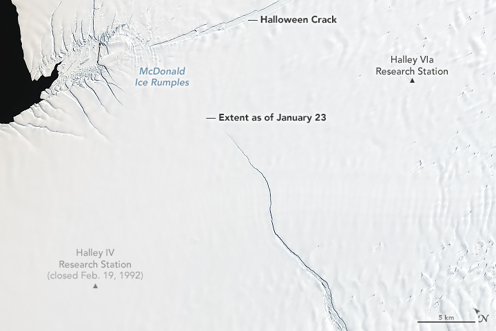 The crack along the top of the January 23 image—the so-called Halloween crack—first appeared in late October 2016 and continues to grow eastward from an area known as the McDonald Ice Rumples. The rumples are due to the way ice flows over an underwater formation, where the bedrock rises high enough to reach into the underside of the ice shelf. This rocky formation impedes the flow of ice and causes pressure waves, crevasses, and rifts to form at the surface.