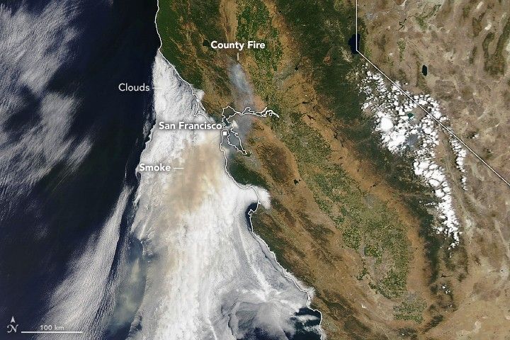 The Moderate Resolution Imaging Spectroradiometer (MODIS) on NASA’s Aqua satellite captured a natural-color image of the fire on the afternoon of July 1. Thick smoke streamed southwest toward San Francisco Bay, where many people woke up to unusually dark skies and peculiar views of orange clouds and fog. Significant amounts of smoke appeared to be drifting above the cloud layer.