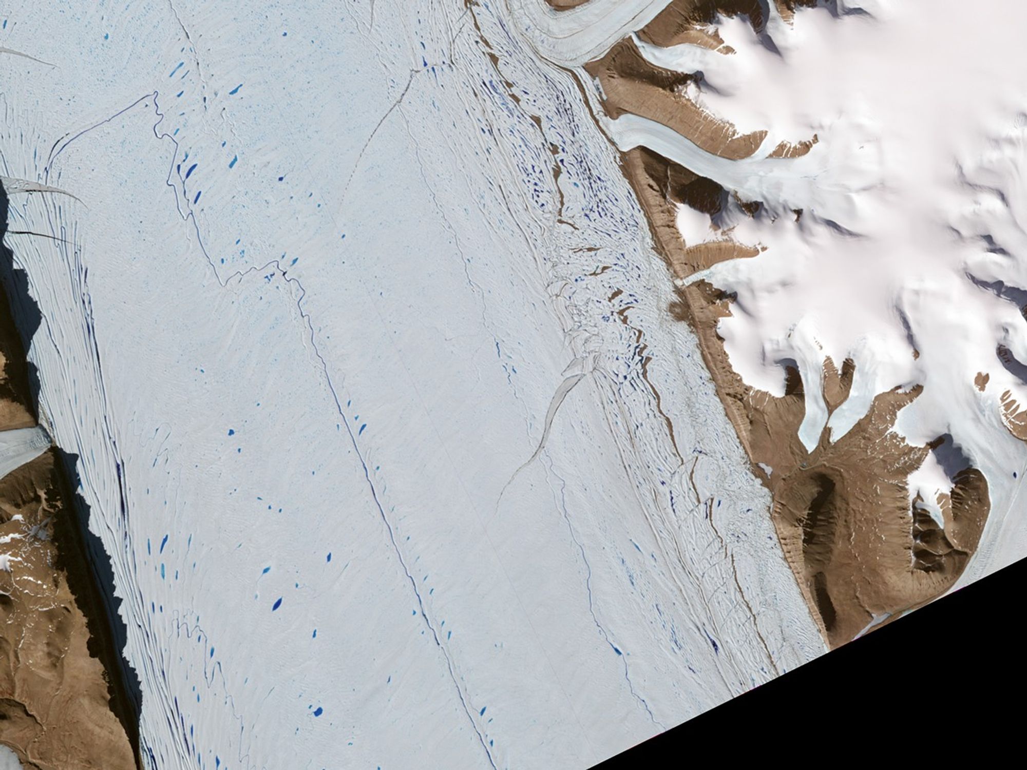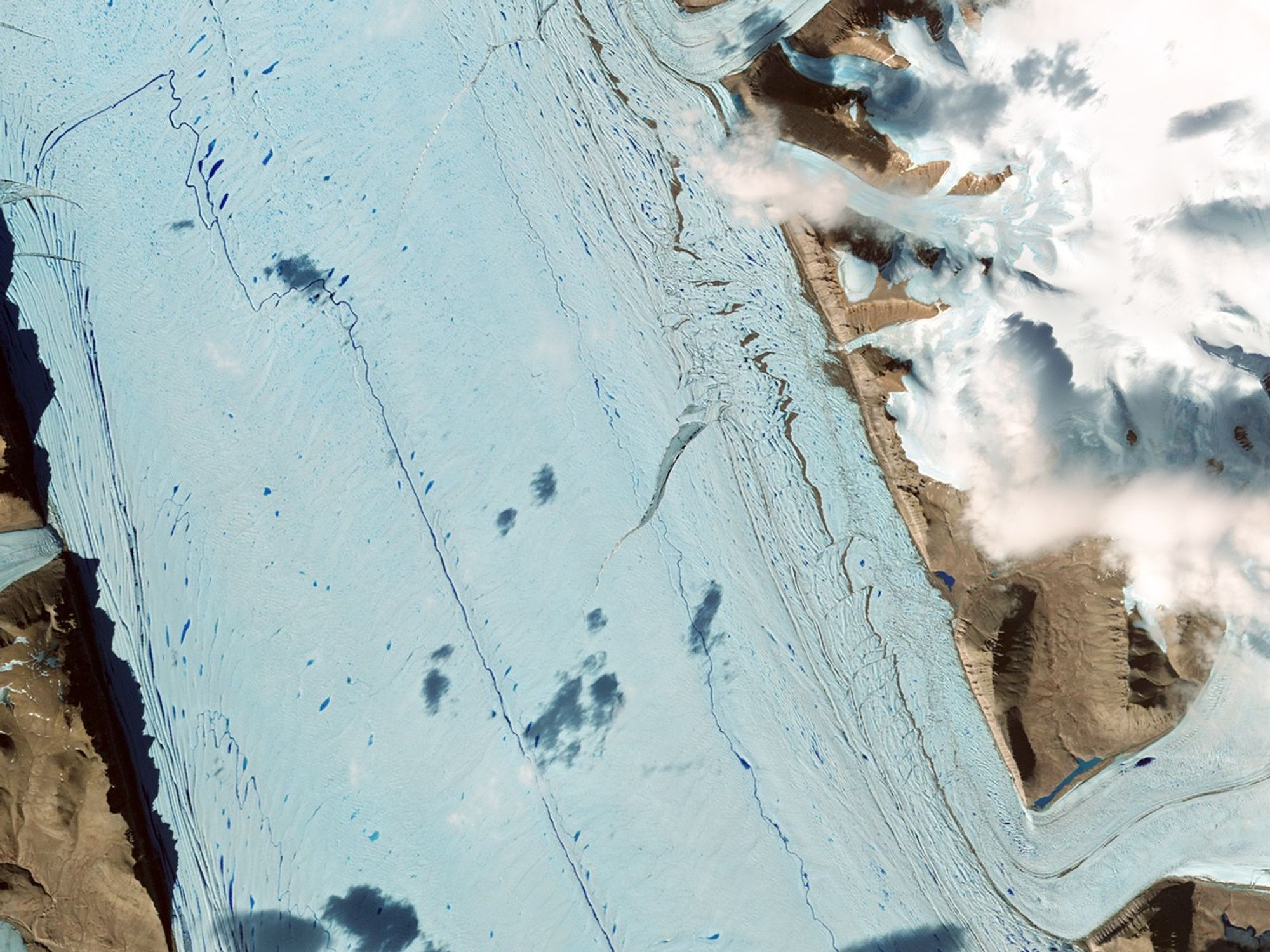 The larger view (bottom) shows areas of open water along the glacier’s margins, and a profusion of ice fragments beyond the tip of the glacier tongue. As a glacier squeezes past the fjord walls, the interaction of the ice and rock produces backstress that keeps the ice relatively compressed. But as pieces of ice break away from the glacier, the backstress is reduced, and the glacier begins to stretch. The rift on this glacier is evidence of the glacier’s stretching and thinning over time.