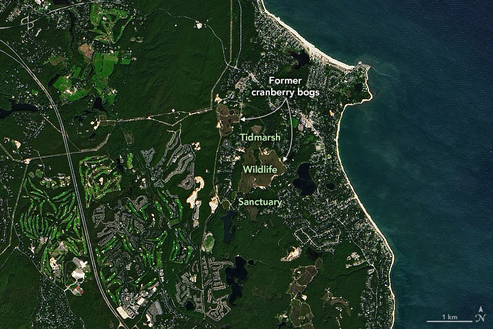 Restoration of the former 600-acre farm and its bogs, now known as the Tidmarsh Wildlife Sanctuary, has improved the waters flowing into Cape Cod Bay and has enhanced the wetland habitat for birds. The site also served as testbed for understanding in-situ measurements of dense organic soils to help scientists better interpret space-based measurements of soil type from NASA’s Soil Moisture Active Passive (SMAP) satellite.