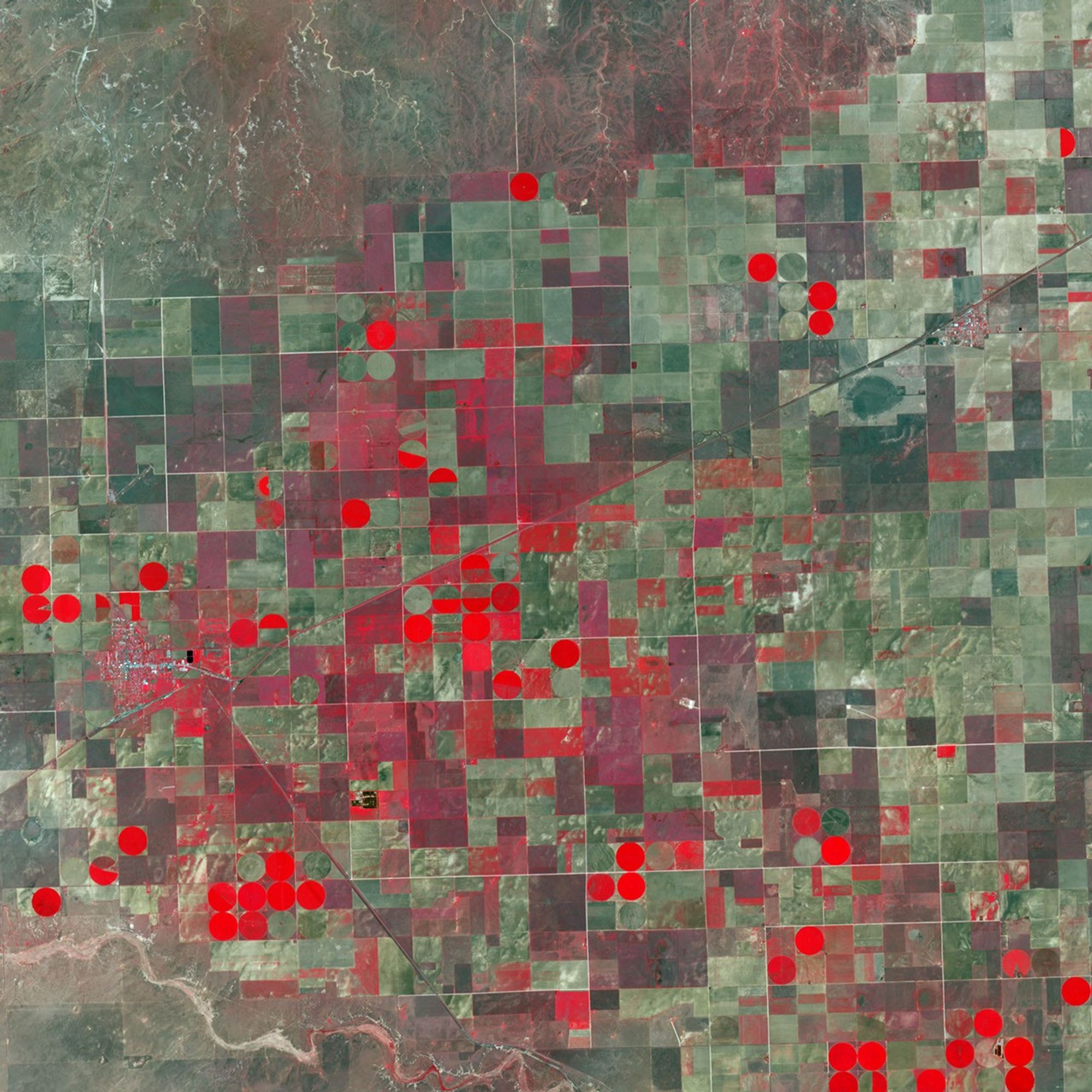 The most robust vegetation occurs in fields with center-pivot irrigation, usually corn in this part of Oklahoma, but sometimes milo, sorghum for livestock feed, or cotton, according to Cherri Brown, district conservationist for the USDA Natural Resources Conservation Service in Boise City. The other circular fields could be residue from harvested crops, but they could also be places where crops have succumbed to drought. Most of the rectangular fields are being prepared for seeding of wheat or are planted with milo and sorghum feed crops. Many of the fields are streaked or marbled with bright, sandy-looking patches. Narrow, straight lines may be cultivation patterns, but the more blotchy-looking areas may be places where the death of vegetation has allowed the region’s sandy soils to blow and drift.